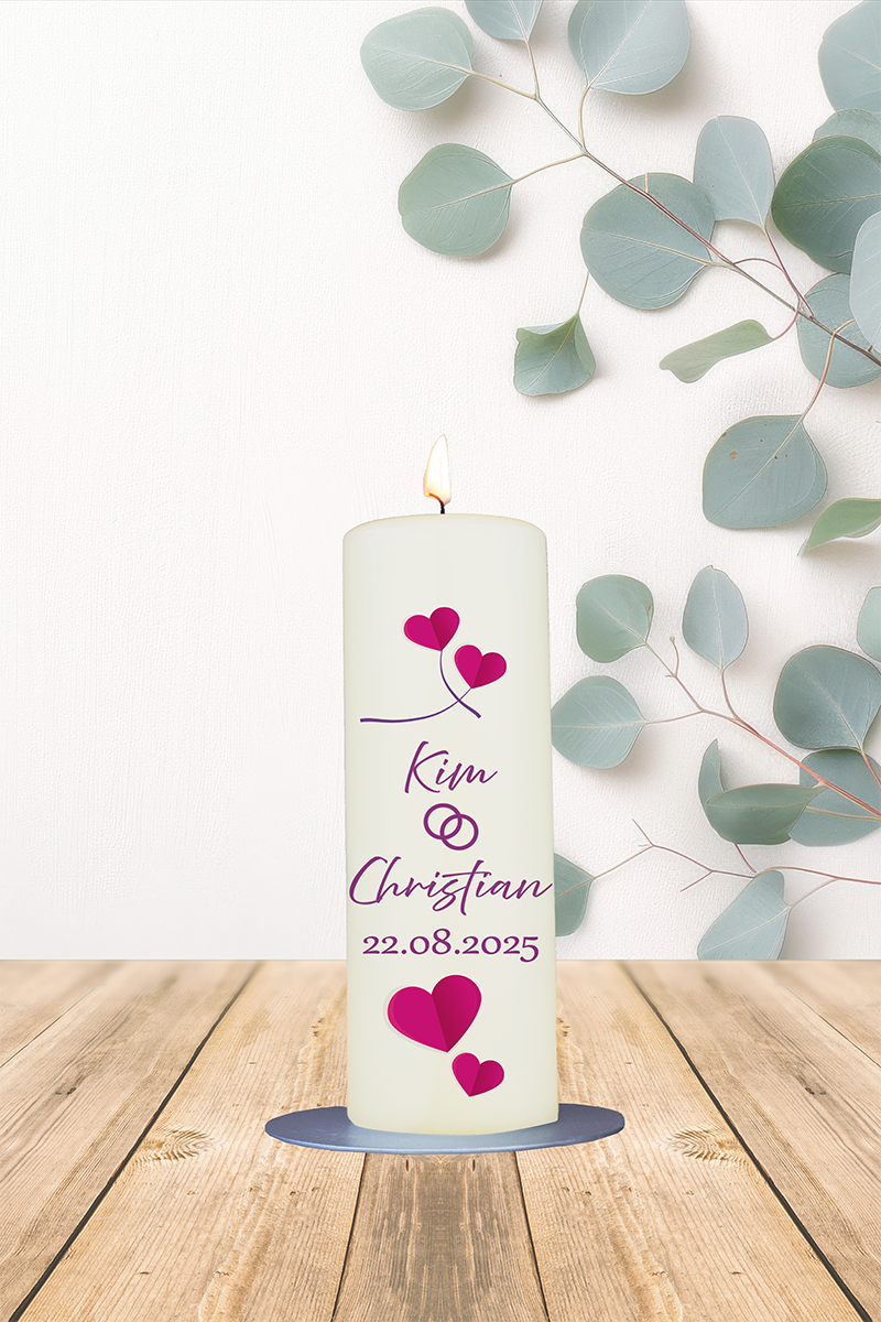 Hochzeitskerze 20x7cm Kim u Christian Stielherzen