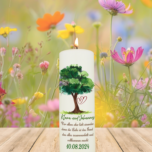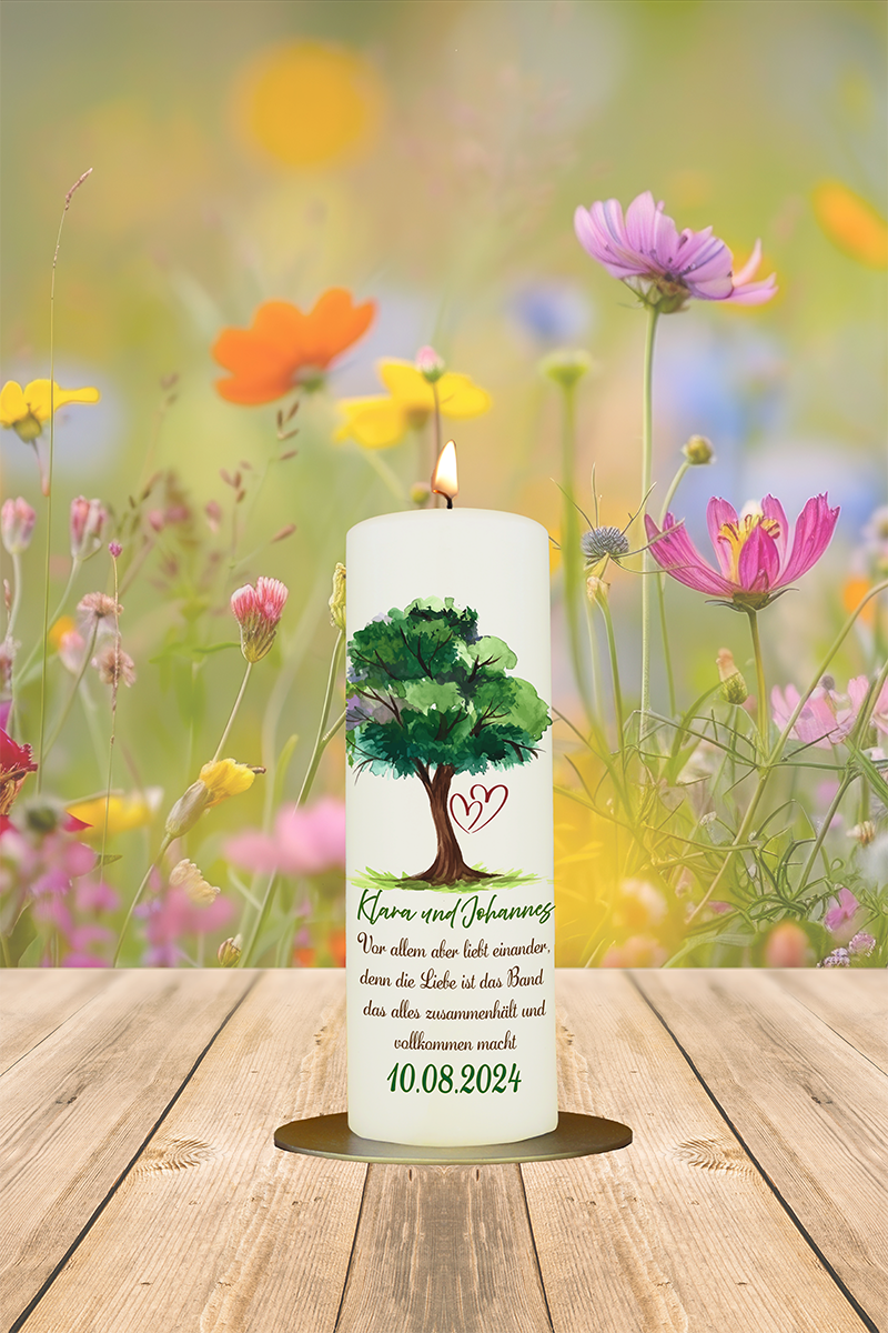 Ein kraftvolles Motiv prägt diese besondere Hochzeitskerze: Ein starker Baum mit ausladender, grüner Krone steht sinnbildlich für ein Leben voller Wachstum, Verwurzelung und Zusammenhalt. Direkt darunter finden sich – liebevoll eingebettet – die individuell gestaltbaren Namen des Brautpaares, etwa „Klara und Johannes 10.08.2024“. Der bedeutungsvolle Spruch „Vor allem aber liebt einander, denn die Liebe ist das Band, das alles zusammenhält und vollkommen macht“ rundet das Design ab und macht diese Kerze zu einem emotionalen Begleiter und bleibenden Erinnerungsstück an den großen Tag.