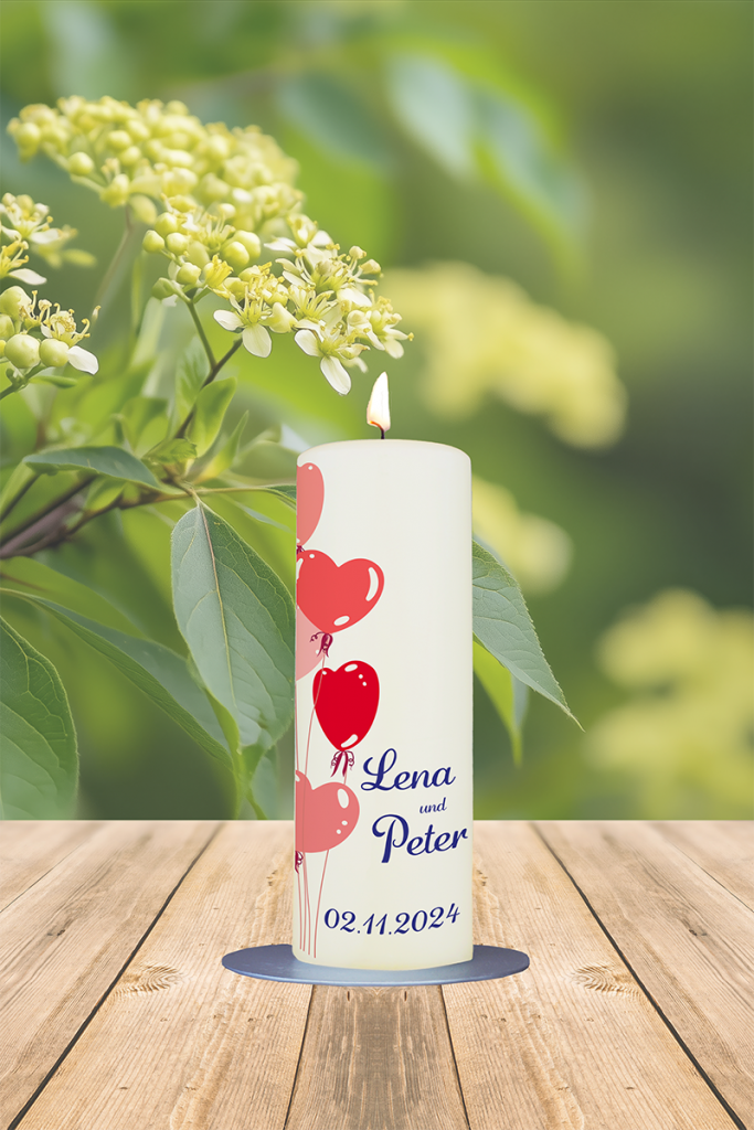 Diese bezaubernde, handgezeichnete Kerze mit roten und rosa Luftballons bringt eine fröhliche und romantische Stimmung in eure Hochzeitsfeier. Sie verkörpert die Leichtigkeit und Freude, die mit dem Beginn eures gemeinsamen Lebens verbunden sind, und wird zum strahlenden Mittelpunkt eurer Zeremonie. Der personalisierte Text „Lena und Peter 02.11.2024“ verleiht der Kerze eine individuelle Note und macht sie zu einem einzigartigen Erinnerungsstück, das die Liebe und den besonderen Tag des Paares festhält. Diese Kerze ist nicht nur ein wunderschöner Akzent während der Feierlichkeiten, sondern auch ein liebevolles Andenken, das euch noch lange nach dem großen Tag begleiten wird. Der Text kann individuell angepasst werden, sodass ihr die Möglichkeit habt, eure eigenen Namen und das Datum eurer Hochzeit zu wählen. Lasst diese Kerze ein Teil eurer unvergesslichen Liebesgeschichte werden!