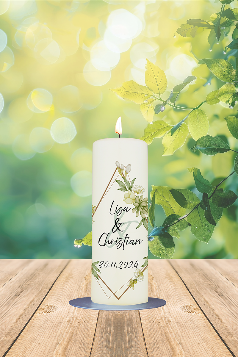 Diese liebevoll illustrierte Hochzeitskerze besticht durch eine zarte Blumenumrandung in sanften Farben, die das Herzstück der Gestaltung elegant einfasst: den individuell anpassbaren Text mit den Namen des Paares – im Beispiel „Lisa & Christian“ – sowie dem besonderen Hochzeitsdatum „30.11.2024“. Die florale Komposition verleiht der Kerze eine festliche und romantische Ausstrahlung und macht sie zu einem stilvollen Erinnerungsstück an den großen Tag. Ideal als persönliches Geschenk zur Hochzeit oder als dekoratives Element bei der Trauungszeremonie selbst.