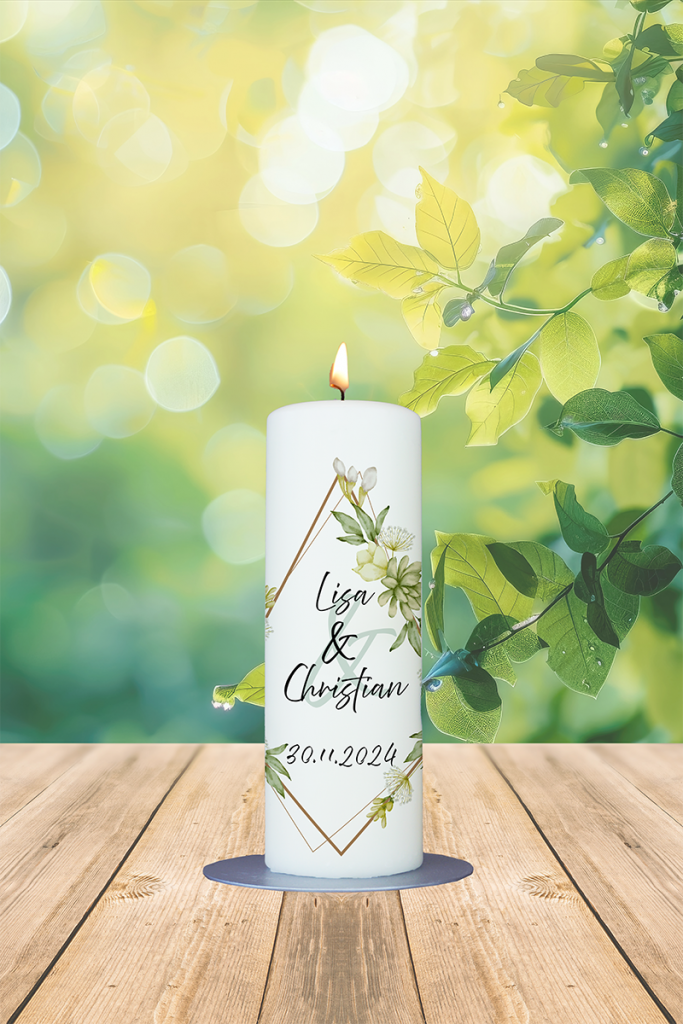 Diese liebevoll illustrierte Hochzeitskerze besticht durch eine zarte Blumenumrandung in sanften Farben, die das Herzstück der Gestaltung elegant einfasst: den individuell anpassbaren Text mit den Namen des Paares – im Beispiel „Lisa & Christian“ – sowie dem besonderen Hochzeitsdatum „30.11.2024“. Die florale Komposition verleiht der Kerze eine festliche und romantische Ausstrahlung und macht sie zu einem stilvollen Erinnerungsstück an den großen Tag. Ideal als persönliches Geschenk zur Hochzeit oder als dekoratives Element bei der Trauungszeremonie selbst.