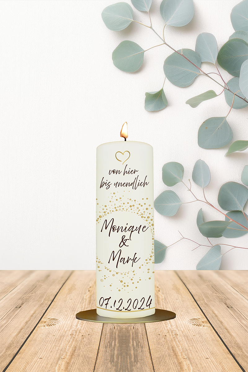 Hochzeitskerze 20x7cm Monique u. Marc Goldkonfetti