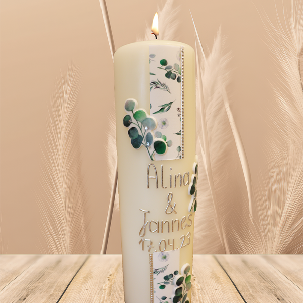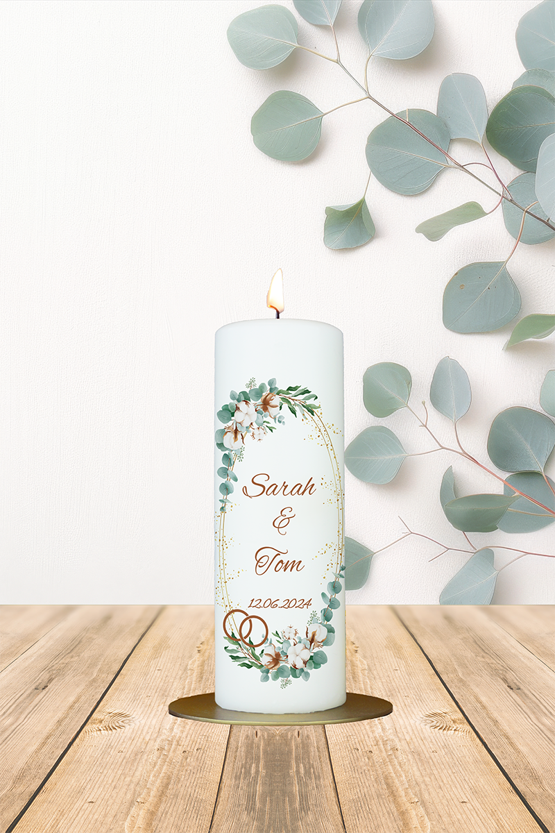 Zart und romantisch gestaltet sich diese Hochzeitskerze mit feinen Blumenranken in sanften Pastelltönen, die den oberen und unteren Rand der Illustration schmücken. In der Mitte steht der individuell anpassbare Text wie beispielsweise „Sarah & Tom 12.06.2024“, der dem Design eine persönliche Note verleiht. Die liebevoll gestaltete Blütenkomposition symbolisiert Leichtigkeit, Harmonie und das Aufblühen einer gemeinsamen Zukunft – ideal als stilvolles Geschenk zur Hochzeit oder als bleibende Erinnerung für das Brautpaar selbst.