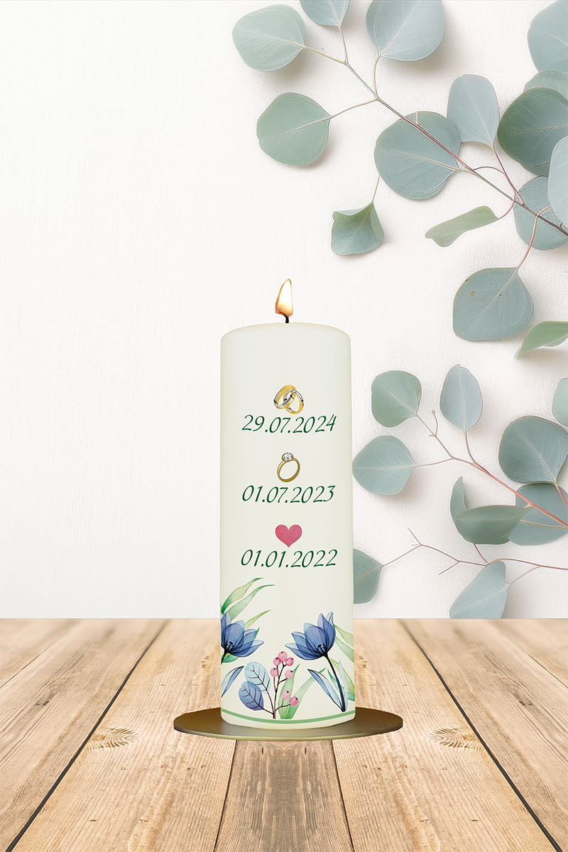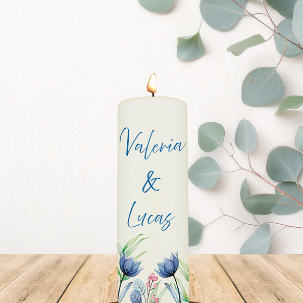 Hochzeitskerze 20x7cm Valeria u. Lukas Blaue Blumen