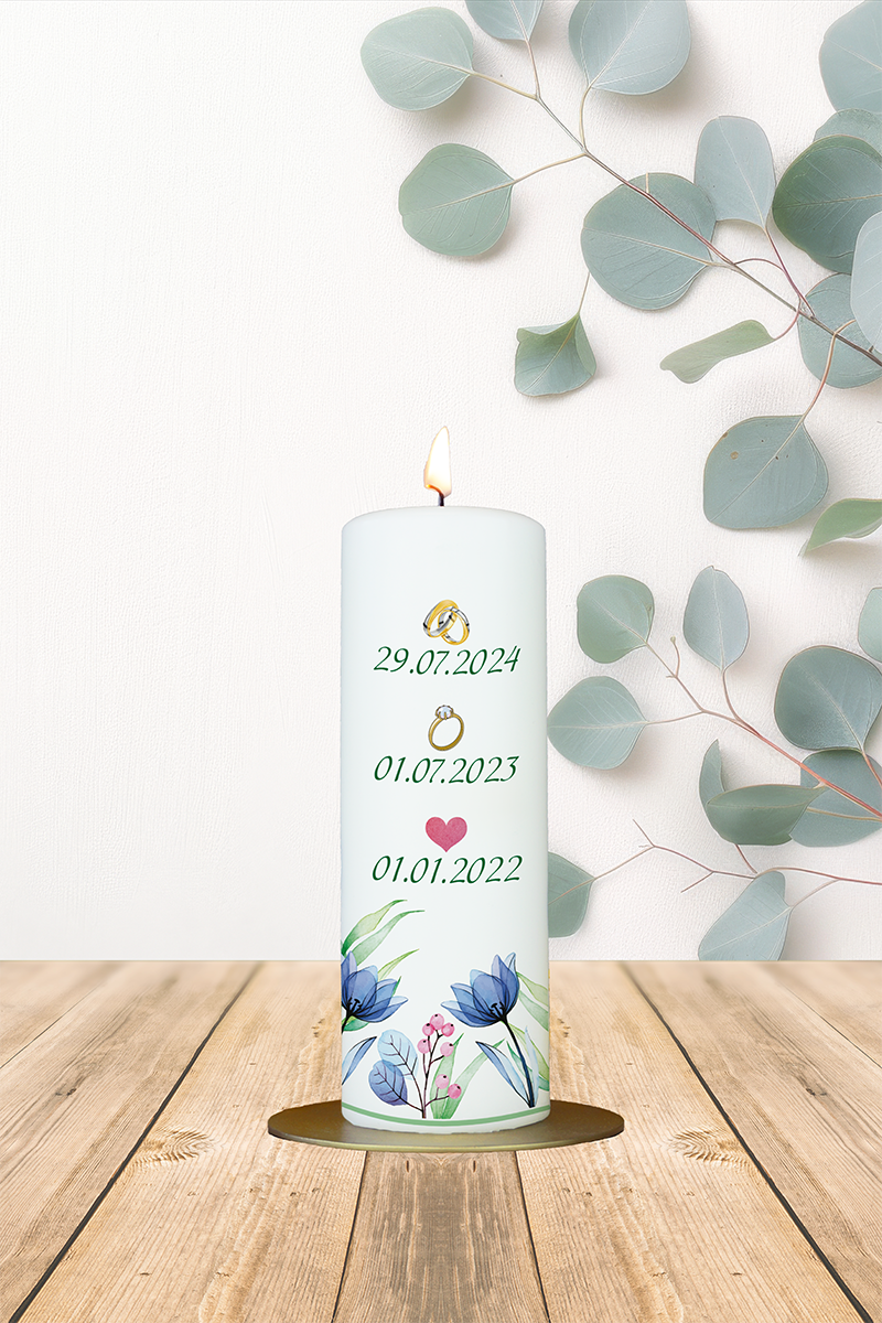 Diese detailreich gestaltete Hochzeitskerze erzählt die ganz persönliche Liebesgeschichte zweier Menschen: Zarte Blumen in sanften Pastelltönen umrahmen symbolträchtig drei liebevolle Stationen der Beziehung – ein Herzchen mit dem Datum des Kennenlernens, ein Verlobungsring mit dem Tag des Versprechens und zwei Eheringe mit dem Hochzeitsdatum. In der Mitte steht der individuell anpassbare Name, wie im Beispiel „Valeria & Lucas“. Diese emotionale Gestaltung macht die Kerze zu einem einzigartigen Erinnerungsstück an die gemeinsamen Meilensteine der Liebe – ein ideales Geschenk zur Hochzeit oder für das Brautpaar selbst als bleibendes Symbol ihres Weges.