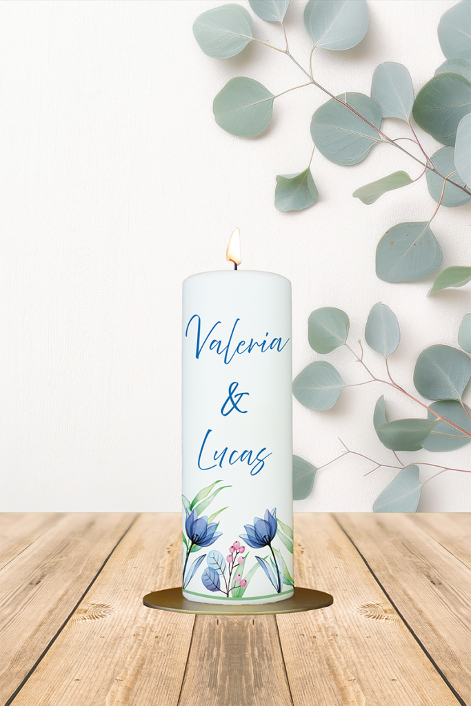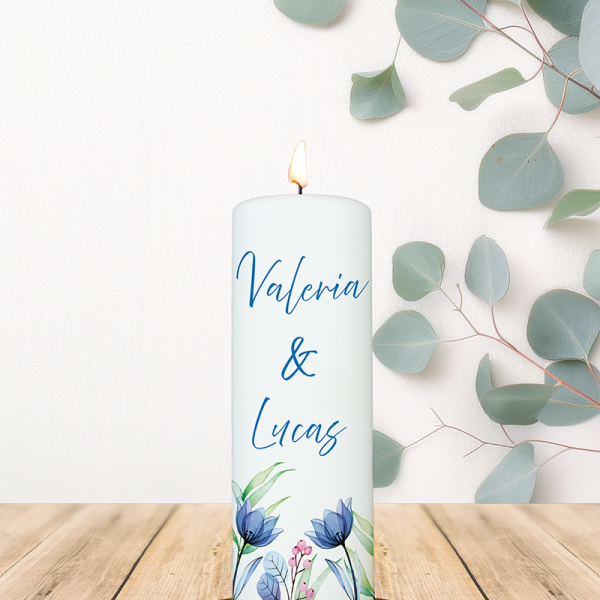 Hochzeitskerze 20x7cm Valeria u. Lukas Blaue Blumen