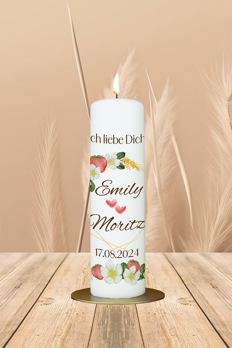Diese charmante Kerze mit einem liebevoll gestalteten Blumenkranz und frischen Erdbeeren bringt eine fröhliche und romantische Note in eure Hochzeitsfeier. Der Blumenkranz symbolisiert die Schönheit und Frische eurer Liebe, während die Erdbeeren für die süßen Momente stehen, die ihr miteinander teilt. Unter der herzlichen Überschrift „Ich liebe Dich“ wird die tiefe Verbundenheit zwischen Emily und Moritz auf besondere Weise zum Ausdruck gebracht.