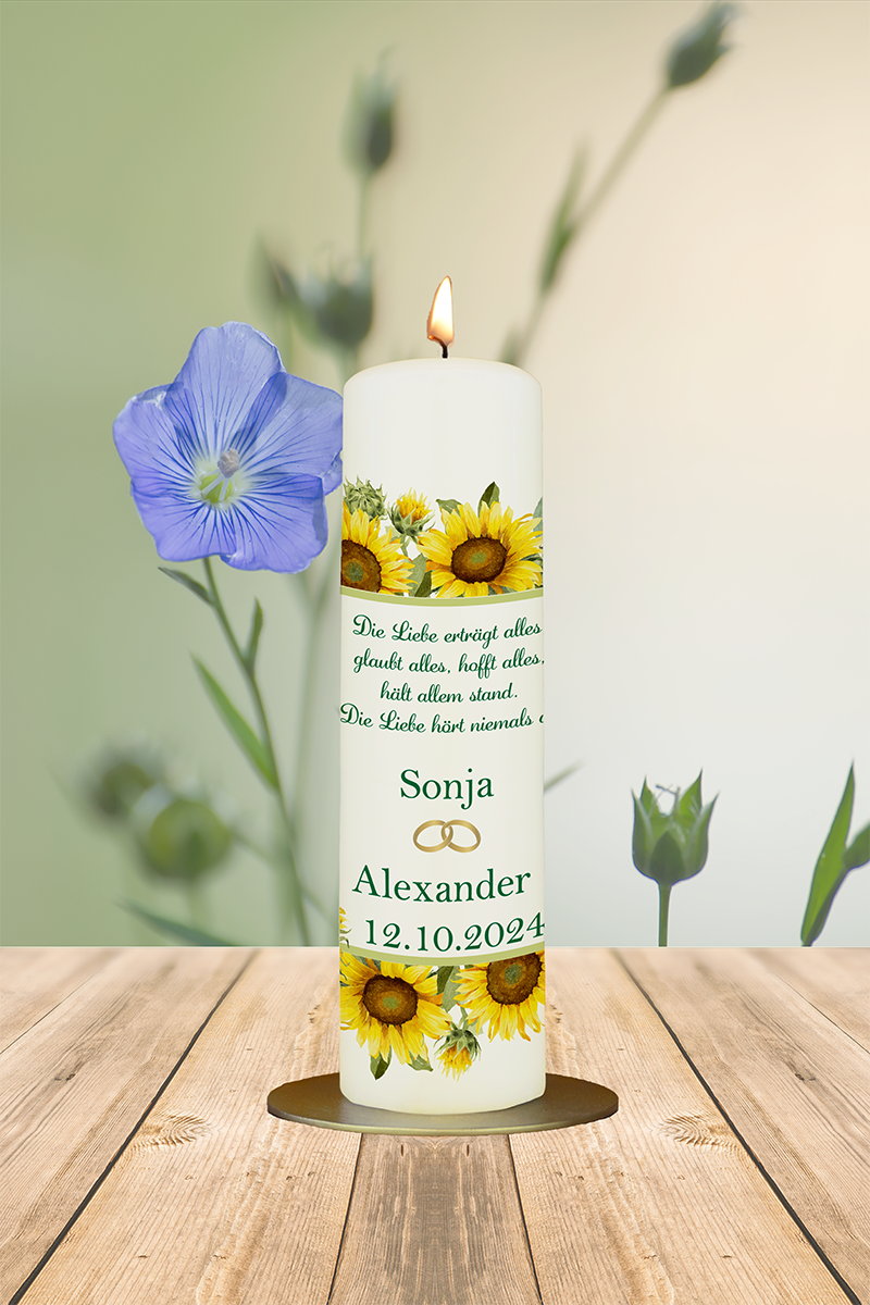 Hochzeitskerze 25x7cm Sonja u. Alexander Sonnenblumen