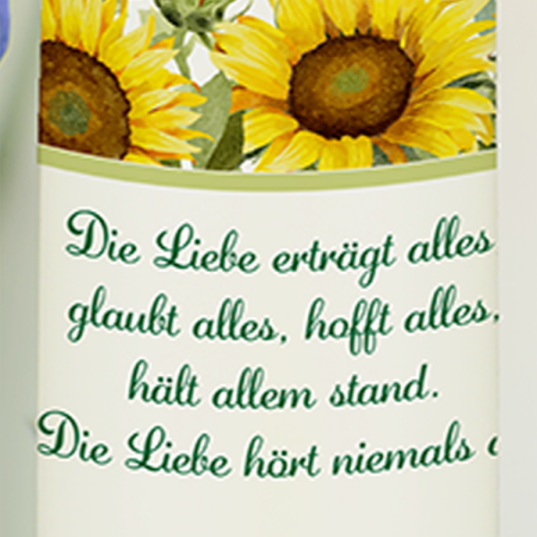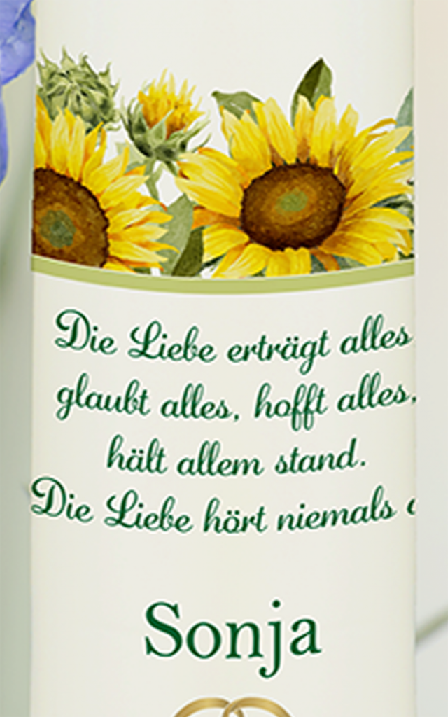 Diese bezaubernde Kerze mit strahlenden Sonnenblumen bringt Licht und Freude in eure Hochzeitsfeier. Die Sonnenblume, ein Symbol für Treue und Beständigkeit, spiegelt die Liebe zwischen Sonja und Alexander wider. Unter der inspirierenden Überschrift „Die Liebe erträgt alles, glaubt alles, hofft alles, hält allem stand. Die Liebe hört niemals auf“ wird die tiefgründige Bedeutung eurer Verbindung perfekt eingefangen.