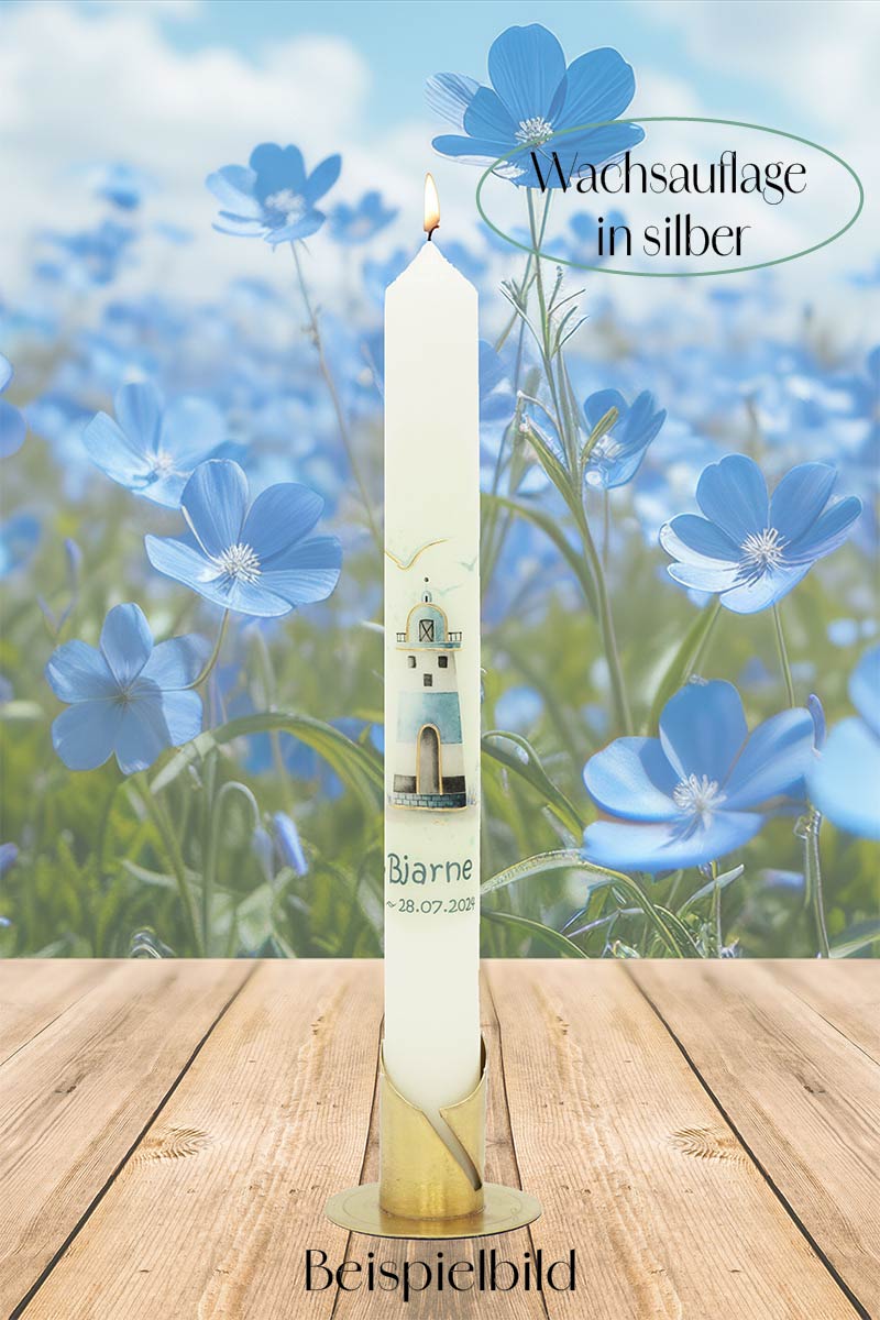 Ein Leuchtturm ist immer da, wenn Du ihn brauchst: Diese Hybridkerze mit dem blau-weißen Leuchtturm am Strand zeigt, dass Dein Weg nie ganz dunkel ist. Die drei Möwen, die darüber fliegen, bringen Freiheit und Leichtigkeit ins Motiv. Dein Name und Datum machen daraus Dein ganz eigenes Licht, das Dir den Weg weist – egal, wie hoch die Wellen schlagen.