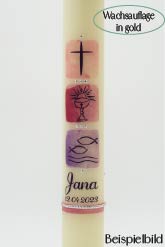 Sanft wie ein Aquarell vereint diese Kerze drei Symbole, die Dir Kraft geben: Das Kreuz für Vertrauen, der Kelch für Gemeinschaft und Fische mit Wellen als Zeichen für Leben und Zuversicht. In warmen Lila- und Rottönen wird Dein Name mit Datum Teil eines ganz persönlichen Lichtmoments, der Dich immer daran erinnert, dass Du geliebt und behütet bist.