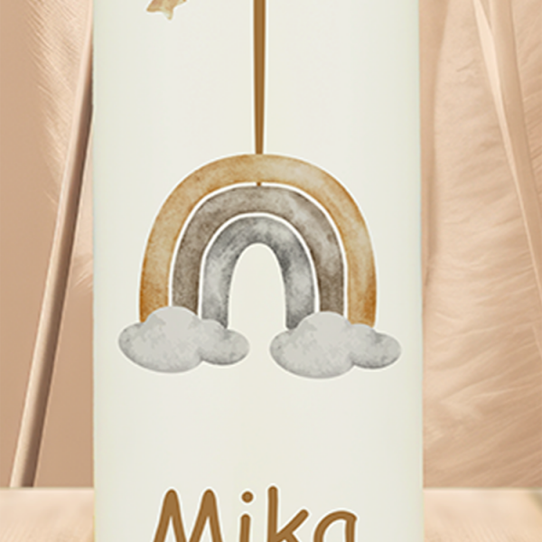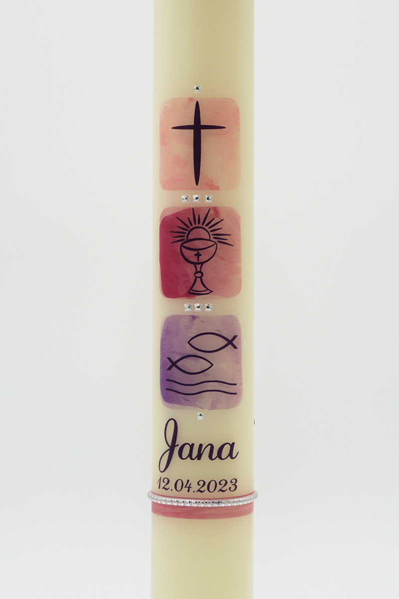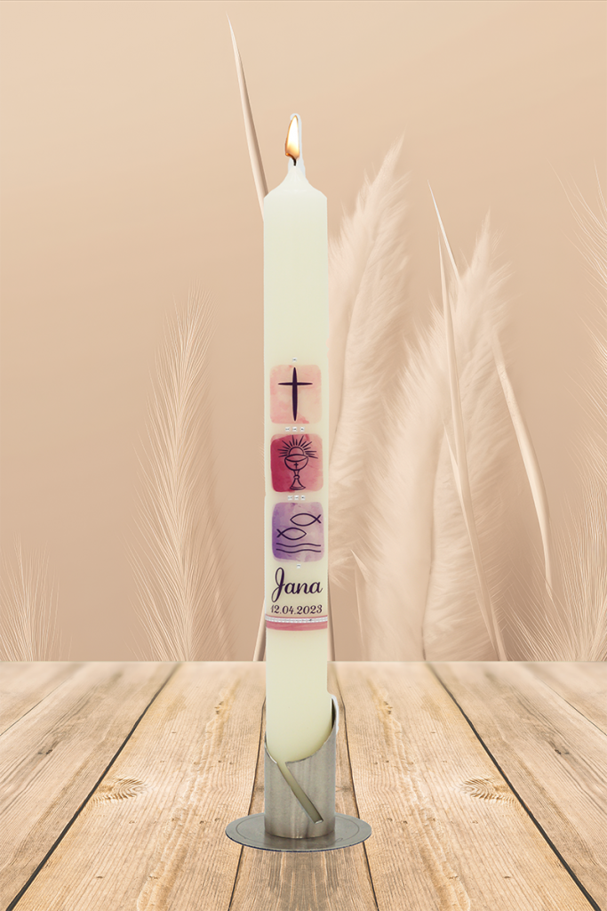 Sanft wie ein Aquarell vereint diese Kerze drei Symbole, die Dir Kraft geben: Das Kreuz für Vertrauen, der Kelch für Gemeinschaft und Fische mit Wellen als Zeichen für Leben und Zuversicht. In warmen Lila- und Rottönen wird Dein Name mit Datum Teil eines ganz persönlichen Lichtmoments, der Dich immer daran erinnert, dass Du geliebt und behütet bist.