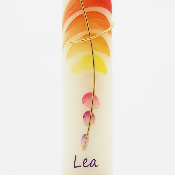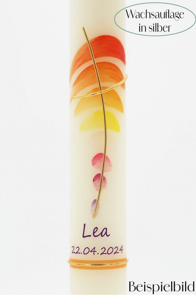 Dieser Regenbogen in warmen Gelb- und Orangetönen bringt Sonne ins Herz. Das silberne, leicht gebogene Kreuz verbindet diesen Lichtmoment mit allem, was Dich stärkt. Dein Name und Datum machen aus dieser Kerze ein strahlendes Symbol dafür, dass Du mit Deinem Glauben immer Deinen ganz eigenen Weg gehen darfst – bunt, lebendig und voller Wärme.