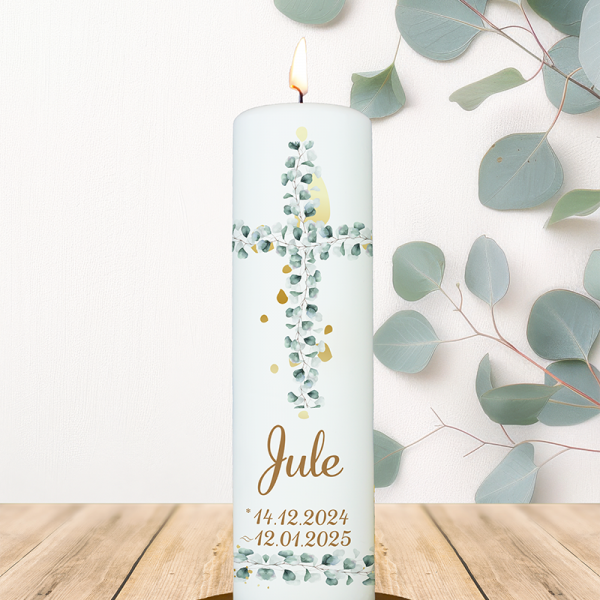 Warm, freundlich und lebensfroh – dieser Regenbogen in Gelb und Orange zeigt, dass Deine Wege von Licht durchzogen sind. Das silberne, gebogene Kreuz umschließt Deinen Glauben wie ein schützender Bogen. Mit Deinem Namen und Datum wird aus dieser Hybridkerze ein individuelles Zeichen dafür, dass Du mit Deinem Vertrauen immer wieder neue Farben ins Leben bringen darfst.