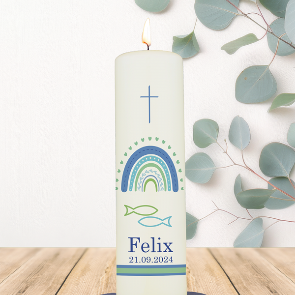 Diese Hybridkerze verbindet starke Symbole mit sanften Farben: Das rote Kreuz auf dem zarten Rosaton steht für Deinen Glauben, die kleinen Sakramente drum herum machen sichtbar, dass Dein Weg behütet ist. Mit Deinem Namen und Datum wird aus diesem Licht ein liebevolles Zeichen dafür, dass Du mit Deinem Vertrauen alle Schritte gehen kannst – gesegnet und beschützt.