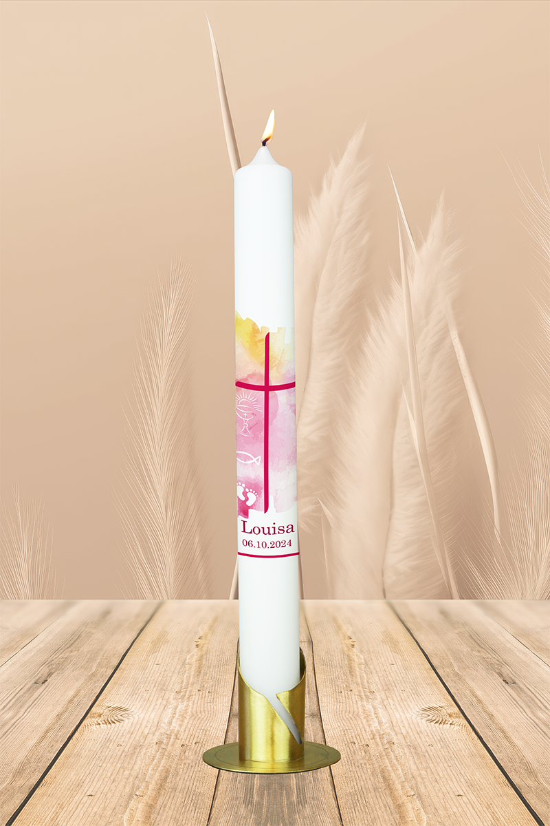 Drei bedeutungsvolle Symbole umgeben ein kraftvolles rotes Kreuz: der Kelch für das Sakrament, der Fisch für den Glauben und Fußspuren als Zeichen für Gottes Begleitung auf dem Lebensweg. Diese Taufkerze für „Louisa“ vereint Tradition und Herz auf wunderschöne Weise.