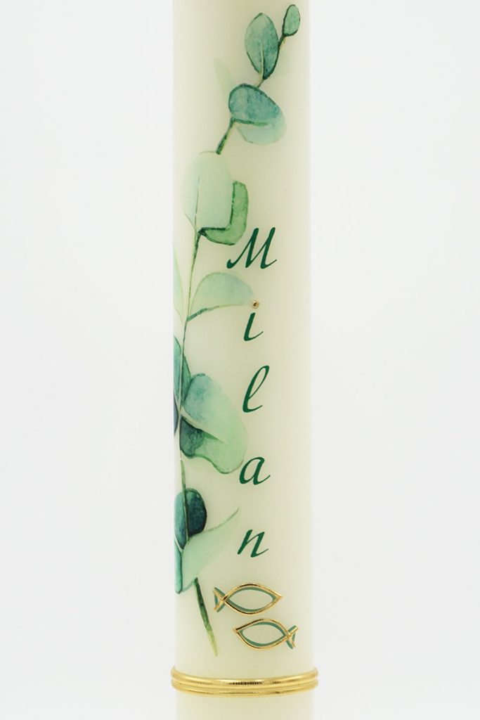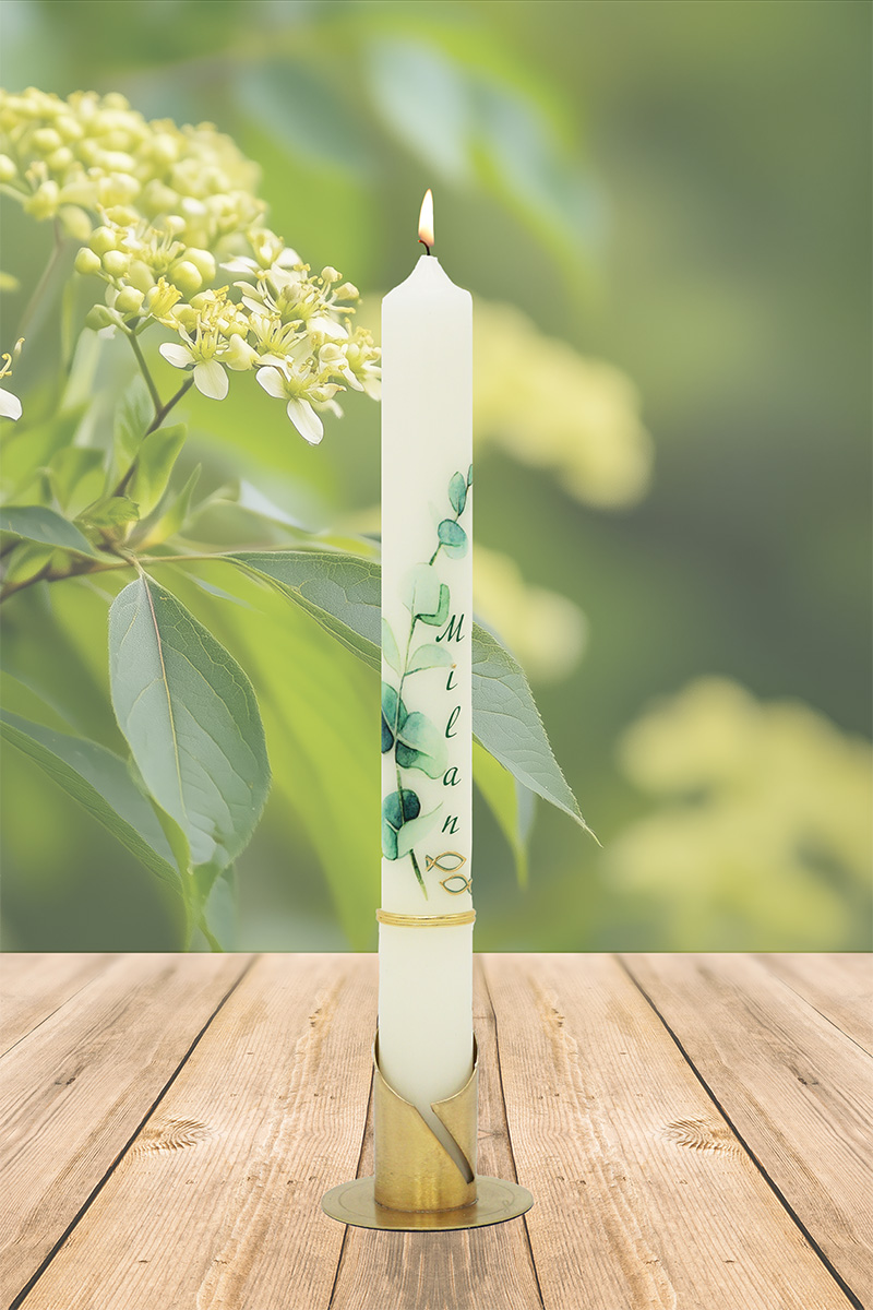 Eine filigrane Eukalyptusranke windet sich sanft über diese Kerze – sie steht für Beständigkeit, Hoffnung und natürliche Schönheit. In Kombination mit zwei wichtigen Lebensdaten und dem Namen „Milan“ entsteht eine moderne, schlichte und dennoch sehr bedeutungsvolle Taufkerze.
