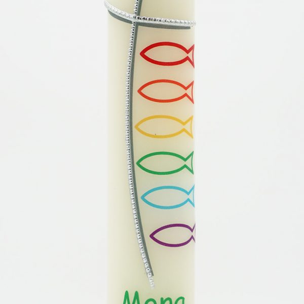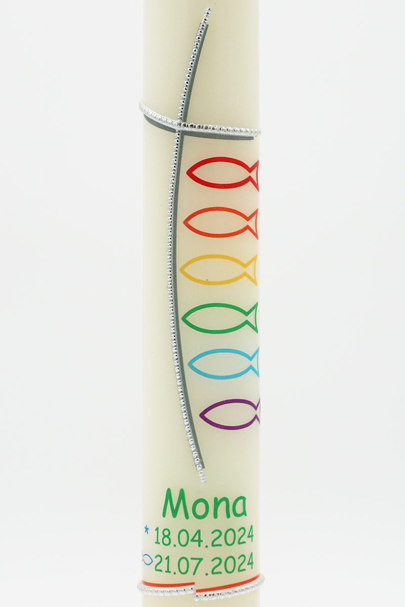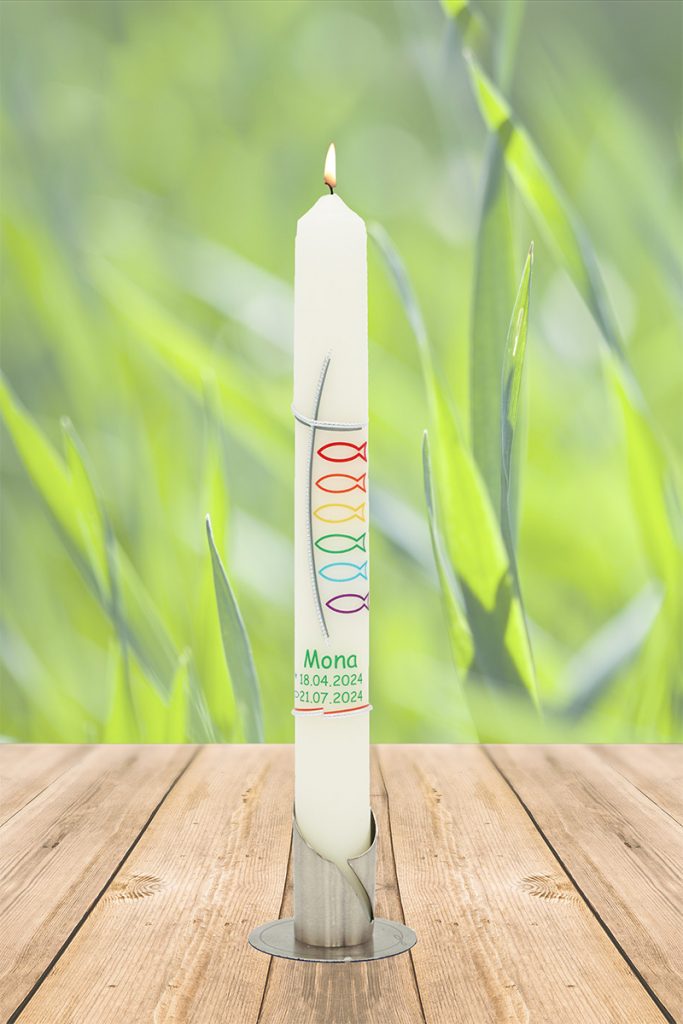 Jeder Fisch in einer anderen Regenbogenfarbe erzählt von Gemeinschaft, Vielfalt und Zusammenhalt. Das feine silberne Kreuz verbindet alles, was Dir Halt gibt. Dein Name und Datum machen diese Hybridkerze zu Deinem persönlichen Lichtmoment, der Dich daran erinnert, dass Du immer Teil von etwas Größerem bist – geborgen, geliebt und begleitet.