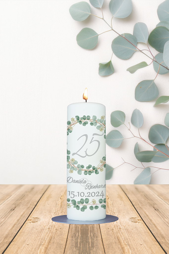 Diese elegante Kerze mit einem wunderschönen Eukalyptuskranz ist ein perfektes Geschenk, um einen besonderen Anlass zu feiern. Der zarte Kranz symbolisiert Frische, Vitalität und die Schönheit der Natur, während der personalisierte Text „25 Daniela und Reinhard 15.10.2024“ die individuelle Note verleiht und die Bedeutung des Anlasses unterstreicht. Diese Kerze steht nicht nur für die Feier eines besonderen Jubiläums, sondern auch für die Liebe und Verbundenheit, die im Laufe der Jahre gewachsen sind. Sie wird während der Feierlichkeiten ein schöner Blickfang sein und gleichzeitig ein liebevolles Andenken darstellen, das das Paar noch lange nach dem großen Tag begleiten wird. Die Möglichkeit, den Text individuell anzupassen, macht diese Kerze zu einem einzigartigen Erinnerungsstück, das die unvergängliche Liebe und die gemeinsamen Erinnerungen feiert.