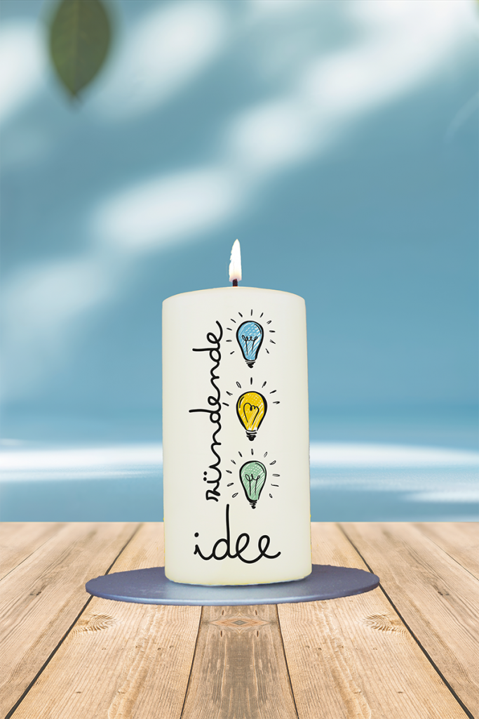 Drei Glühbirnen übereinander, leuchtend kreativ – diese Kerze steht ganz im Zeichen guter Einfälle. Mit dem Spruch „Zündende Idee“ ist sie das perfekte Geschenk für Querdenker, Visionäre und alle, die Inspiration feiern.