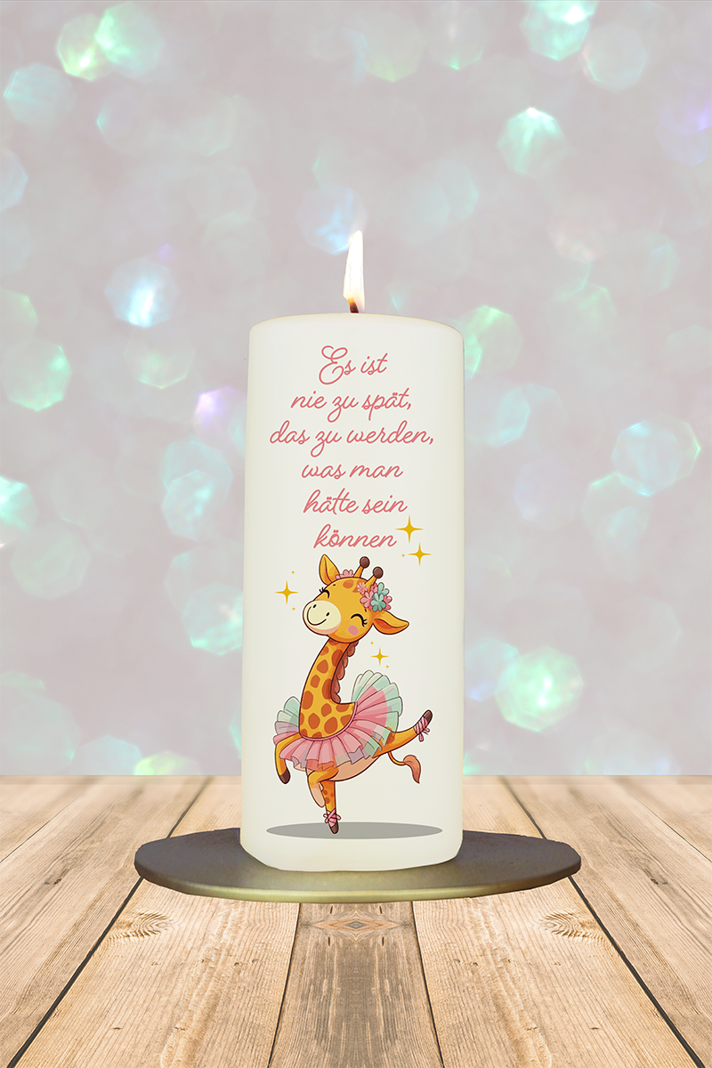 Mit Anmut, Mut und Tüllrock zeigt diese kleine Giraffe, dass Träume kein Verfallsdatum haben. Der inspirierende Spruch bringt Hoffnung, Zuversicht und ein Lächeln – wunderbar geeignet für Neustarts, Geburtstage oder kleine Lebensimpulse.