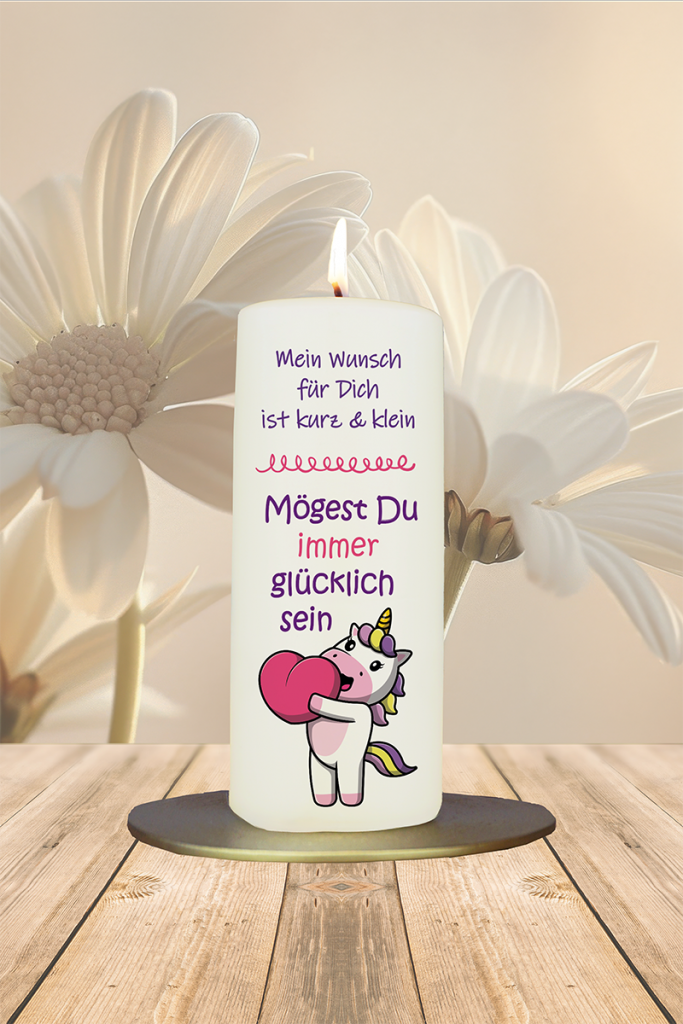Zuckersüß, märchenhaft und voller Herzenswärme: Dieses Einhorn-Kerzchen ist ein liebevoller Glücksbringer mit poetischer Botschaft. Ob für Kinder, beste Freundinnen oder einfach jemanden, dem du Glück wünschst – diese Kerze ist ein Lichtblick in Reimform.