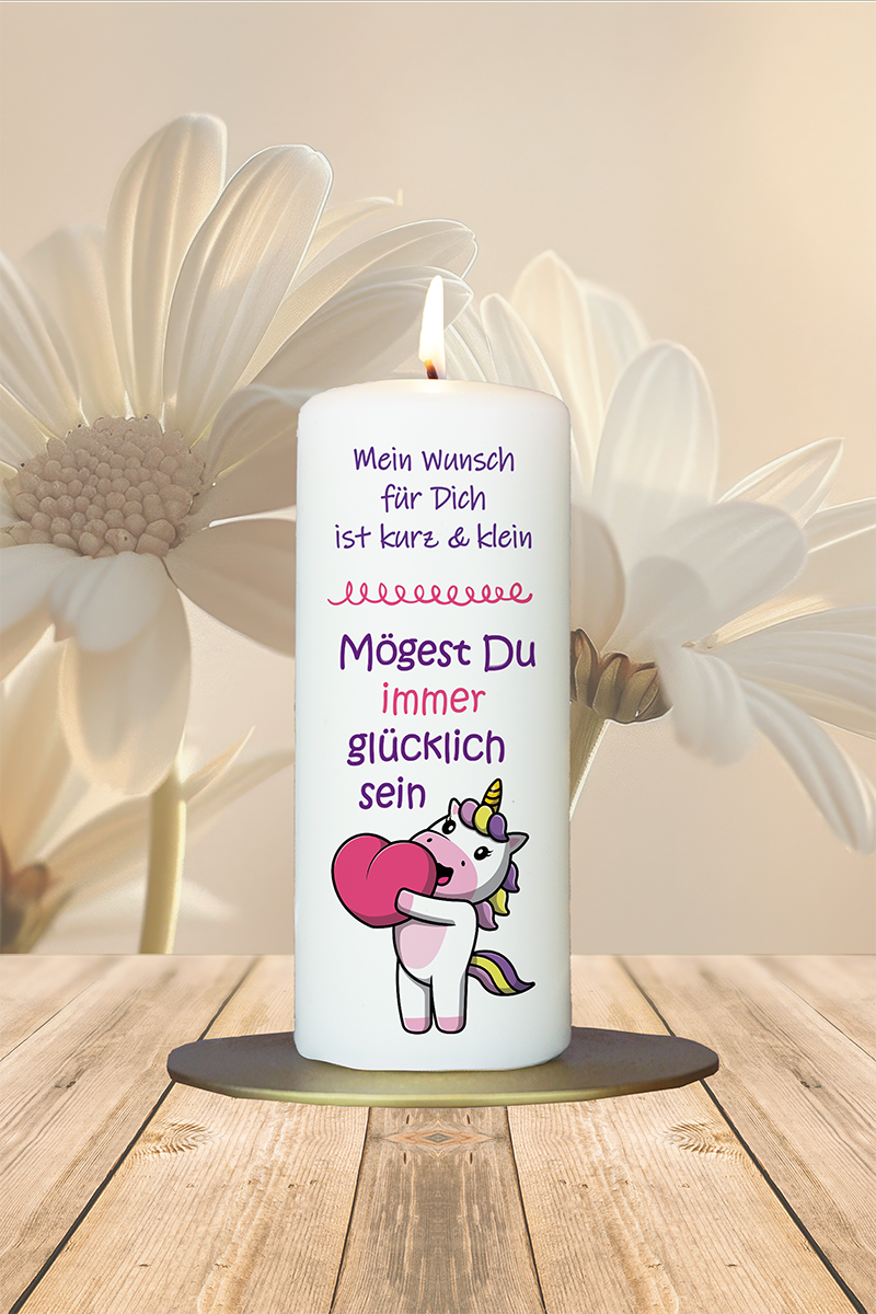 Zuckersüß, märchenhaft und voller Herzenswärme: Dieses Einhorn-Kerzchen ist ein liebevoller Glücksbringer mit poetischer Botschaft. Ob für Kinder, beste Freundinnen oder einfach jemanden, dem du Glück wünschst – diese Kerze ist ein Lichtblick in Reimform.