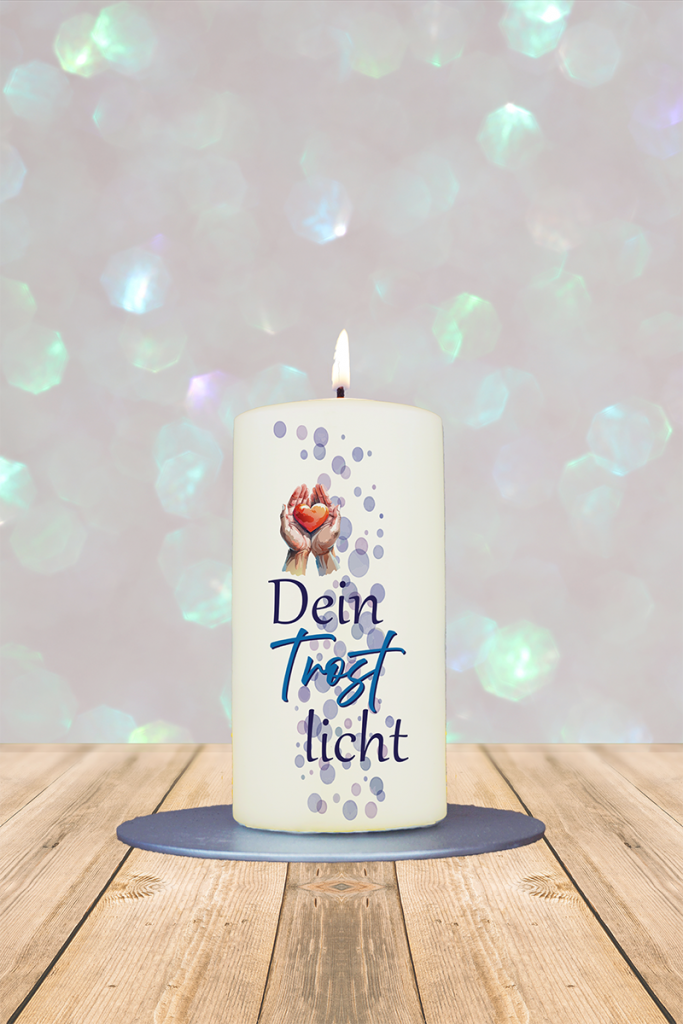 Zwei Hände, die ein Herz behutsam tragen – dieses Kerzchen spendet Trost, wenn Worte fehlen. Das „Trostlicht“ ist eine stille Umarmung in Lichtform, ein Zeichen der Zuwendung für schwierige Zeiten und ein Lichtblick für müde Herzen.