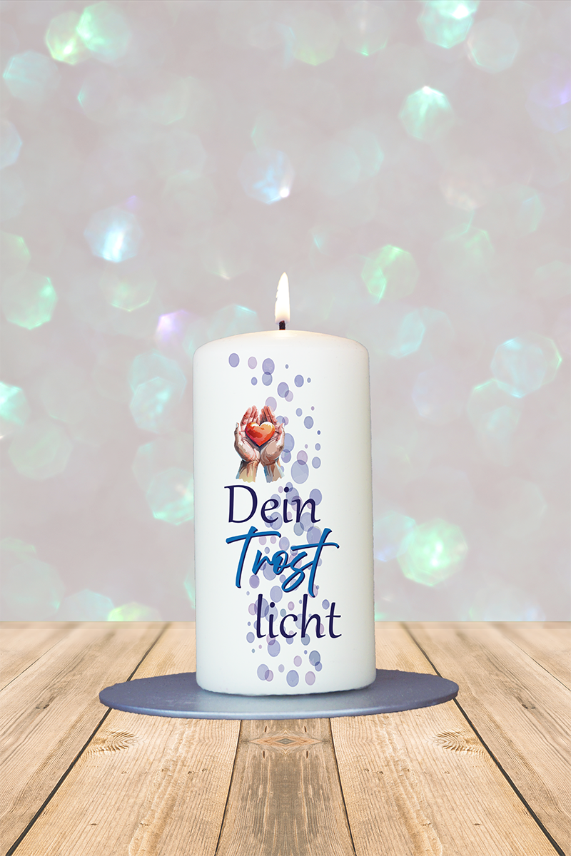 Zwei Hände, die ein Herz behutsam tragen – dieses Kerzchen spendet Trost, wenn Worte fehlen. Das „Trostlicht“ ist eine stille Umarmung in Lichtform, ein Zeichen der Zuwendung für schwierige Zeiten und ein Lichtblick für müde Herzen.
