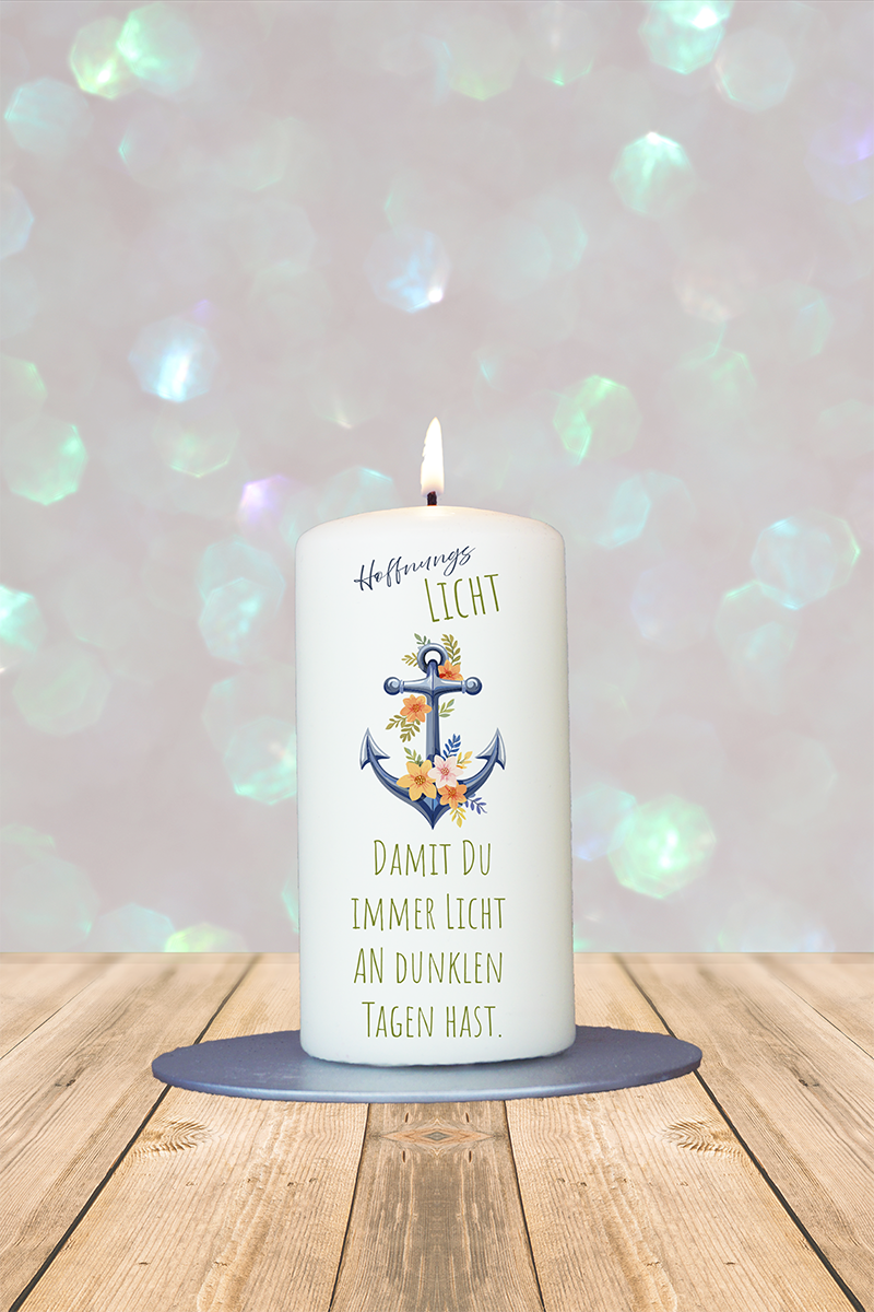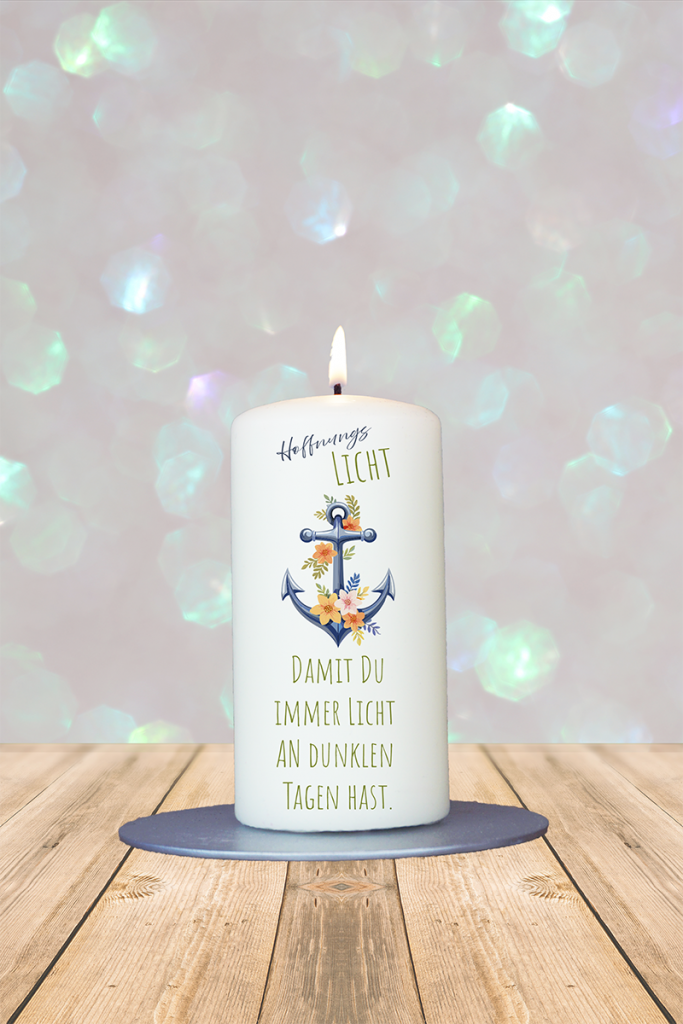 Dieses liebevoll gezeichnete Kerzchen mit Anker und floraler Umrahmung schenkt inneren Halt. Das „Hoffnungslicht“ erinnert daran, dass auch schwere Zeiten vorübergehen – und dass da immer jemand ist, der an dich denkt.