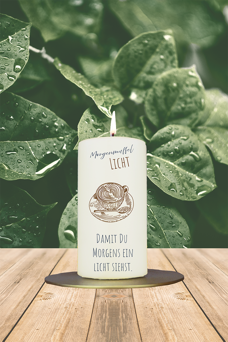 Für alle, die morgens lieber nochmal die Decke über den Kopf ziehen würden, kommt dieses Kerzchen genau richtig: Mit einer Kaffeetasse, Löffel und dem Augenzwinkern im Text bringt es Licht in den trübsten Start in den Tag. Das „Morgenmuffel-Licht“ sorgt für ein erstes Lächeln noch vor dem ersten Kaffee.