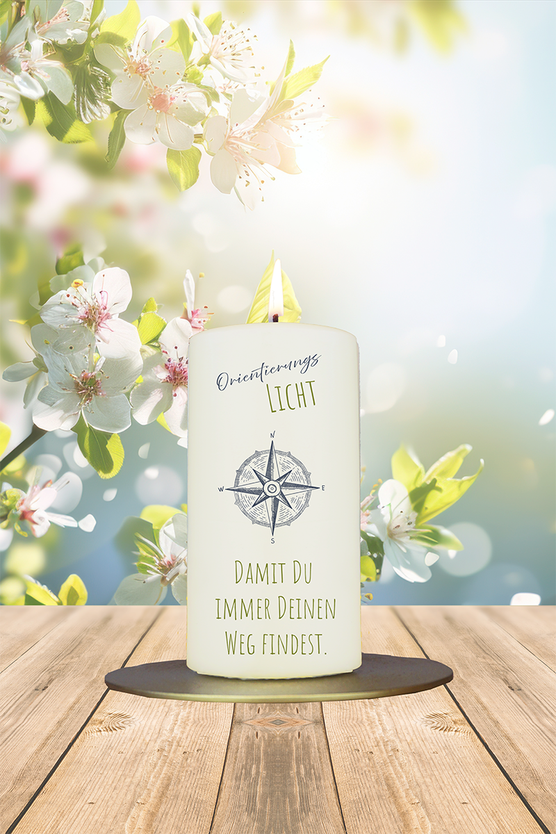 Ein stilisierter Kompass leuchtet auf dieser Kerze – und sendet eine klare Botschaft: Du bist nicht allein unterwegs. Das „Orientierungslicht“ begleitet auf Umwegen, bei Neuanfängen oder einfach, wenn der nächste Schritt gerade schwerfällt.