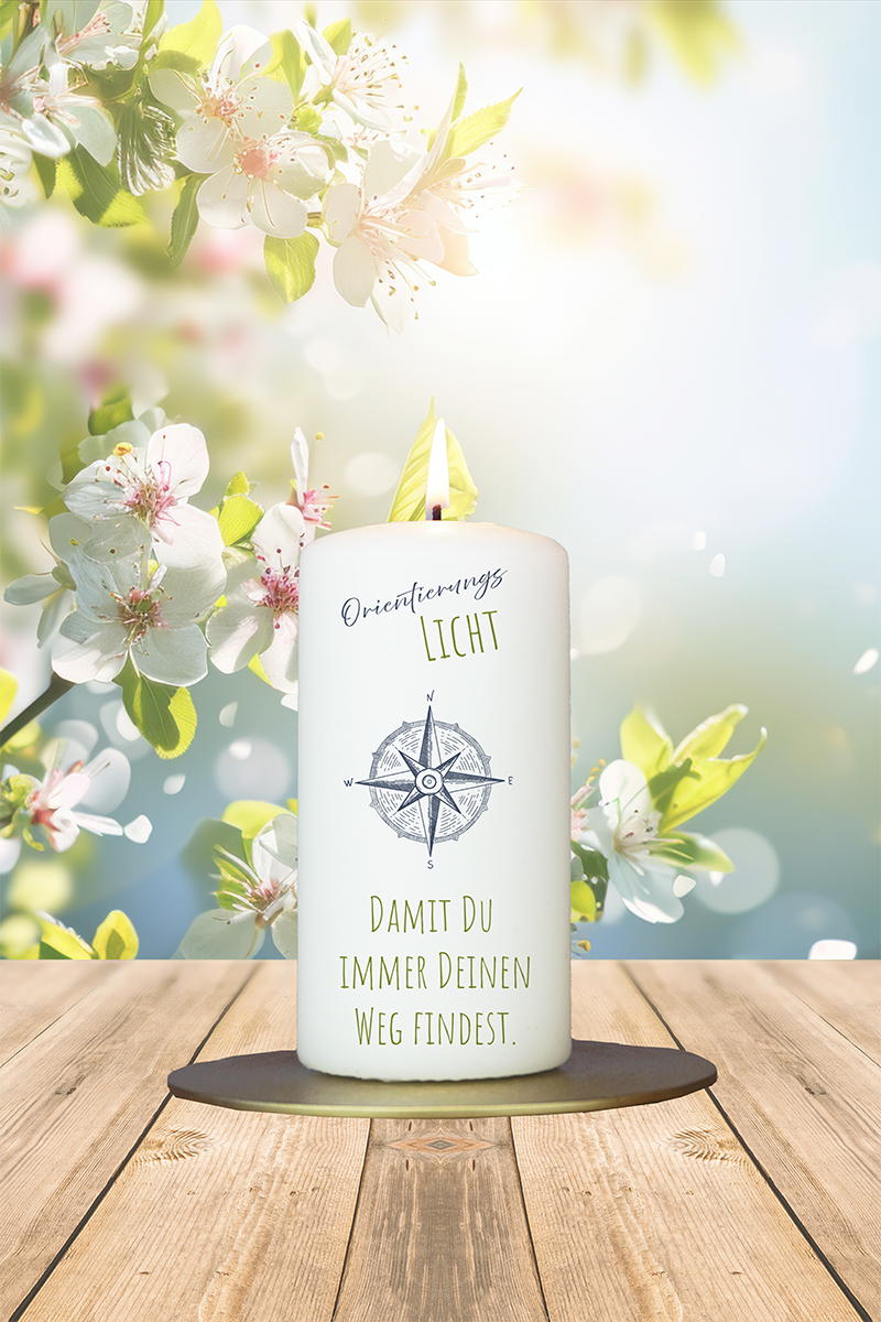 Ein stilisierter Kompass leuchtet auf dieser Kerze – und sendet eine klare Botschaft: Du bist nicht allein unterwegs. Das „Orientierungslicht“ begleitet auf Umwegen, bei Neuanfängen oder einfach, wenn der nächste Schritt gerade schwerfällt.
