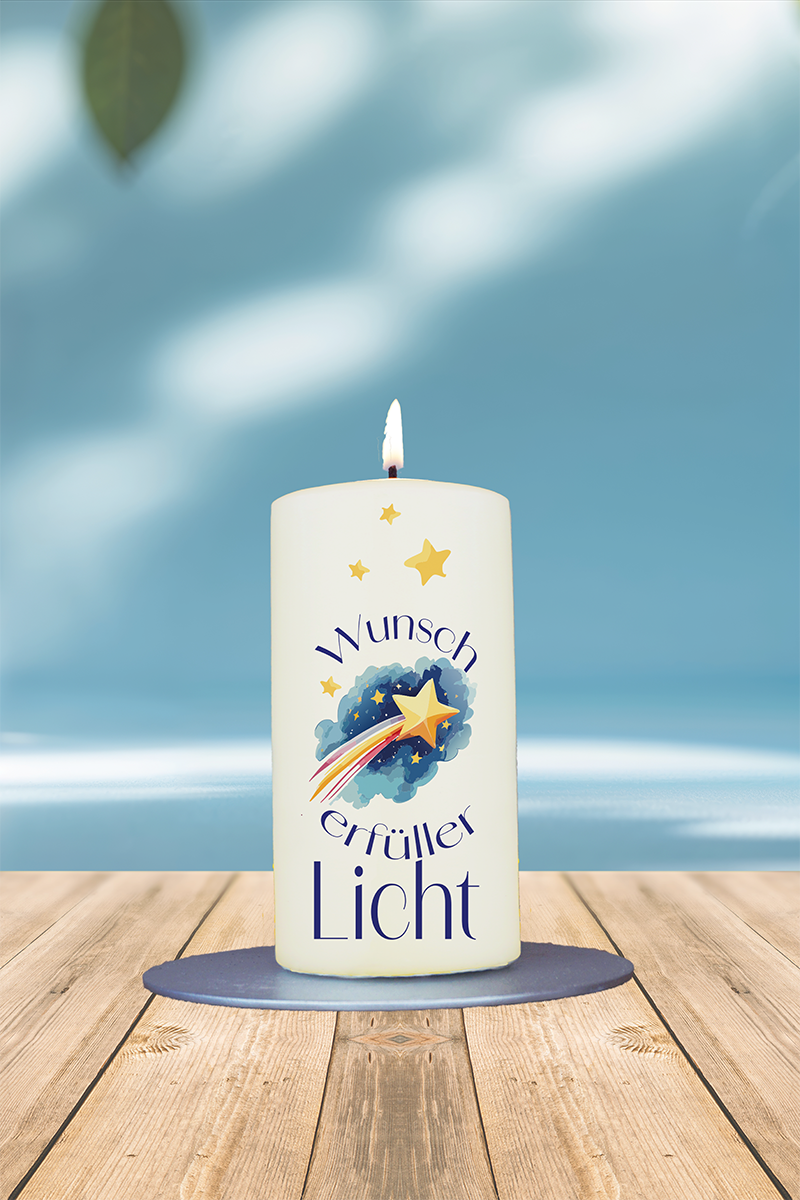 Eine Sternschnuppe auf sanftem Hintergrund – dieses Kerzchen trägt einen Wunsch in sich. Das „Wunscherfüller-Licht“ ist perfekt für Geburtstage, Neuanfänge oder Herzenswünsche, die man auf leise Weise weitergeben möchte.