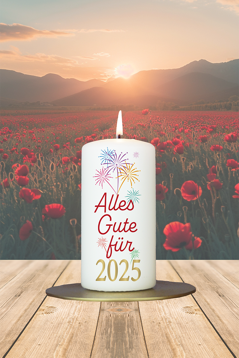 Diese Kerze zündet das neue Jahr symbolisch an – mit einem leuchtenden Feuerwerk und dem Wunsch „Alles Gute für 2025“. Sie bringt Vorfreude, Optimismus und das schöne Gefühl, dass ein Neuanfang voller Möglichkeiten steckt.