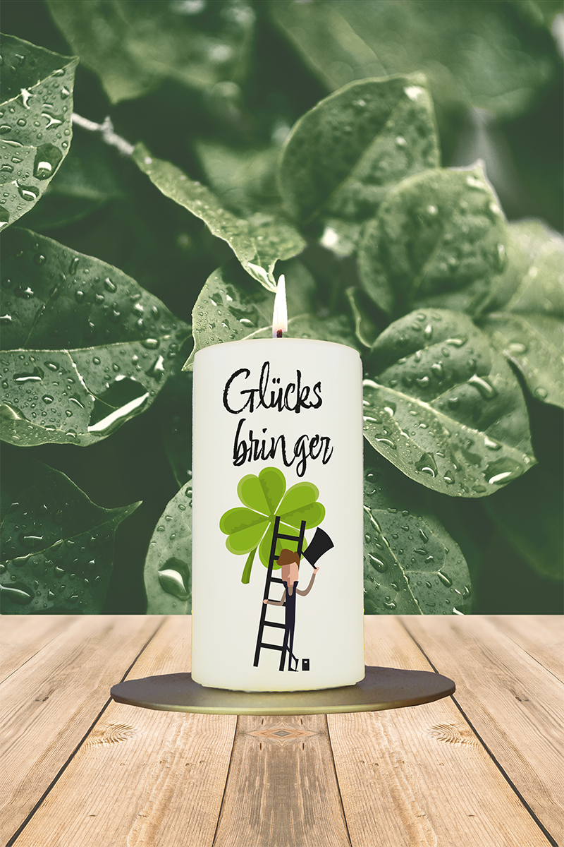 Der klassische Schornsteinfeger, modern interpretiert: Diese Kerze trägt das Symbol des Glücks ins neue Jahr. Der schlichte Spruch „Glücksbringer“ macht sie zu einem stimmigen Geschenk für liebe Menschen – mit Wurzeln in einer schönen Tradition.