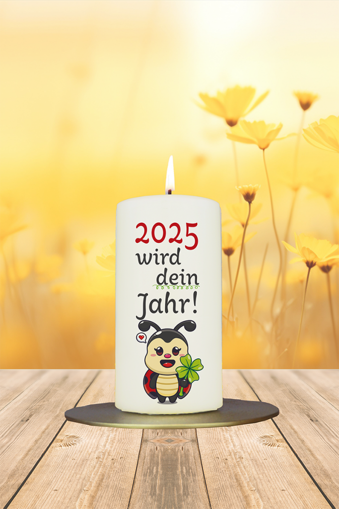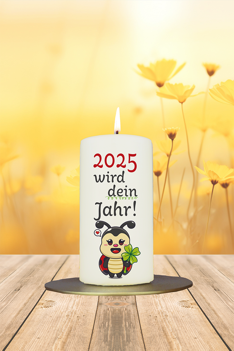 Ein Marienkäfer mit vierblättrigem Kleeblatt bringt das Glück direkt ins Herz. Mit der liebevollen Botschaft „2025 wird dein Jahr!“ ist diese Kerze ein echter Lichtblick – perfekt für Menschen, die Ermutigung, Zuversicht oder einfach einen guten Wunsch brauchen.