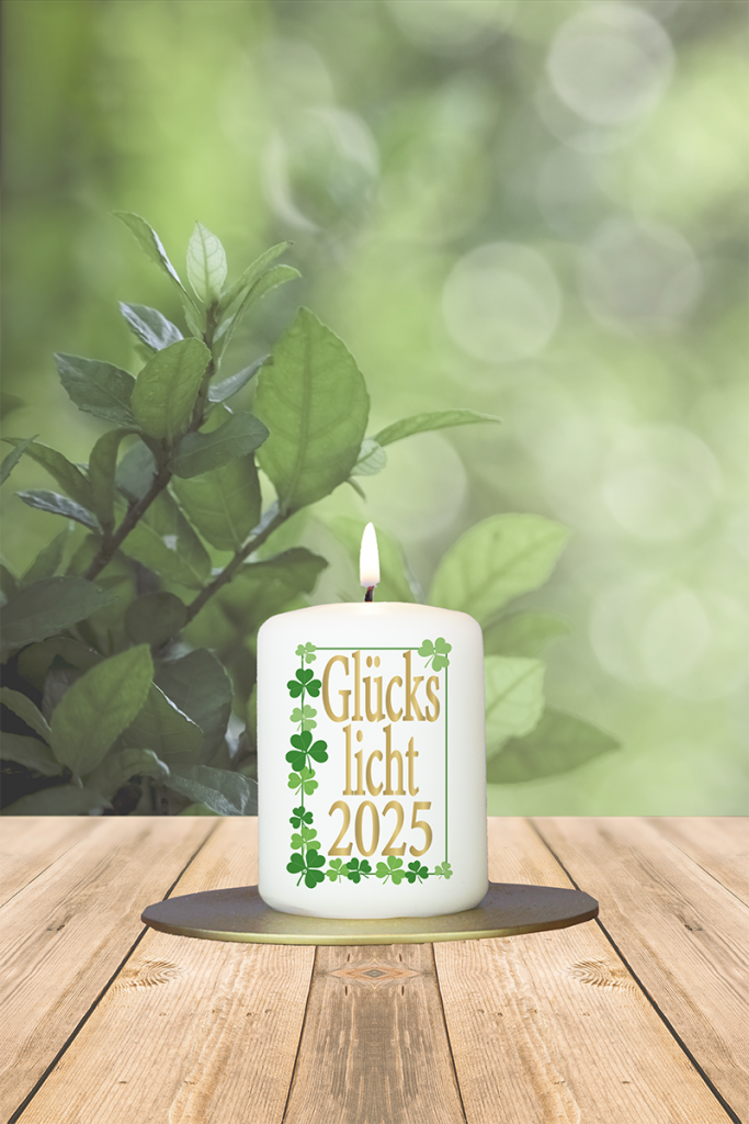 Zarte Kleeblätter ranken sich rund um diese Kerze und tragen eine klare Botschaft: „Glückslicht 2025“. Ein schönes Mitbringsel zum Jahreswechsel oder ein kleiner Hoffnungsträger für das ganze Jahr – mit dieser Kerze ziehst du Glück magisch an.