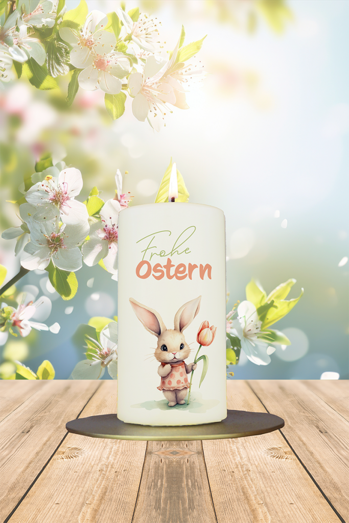 Dieses niedliche Osterhasenmädchen mit einer Tulpe bringt den Frühling direkt ins Herz. Die liebevolle Illustration und der klassische Gruß „Frohe Ostern“ machen diese Kerze zu einem bezaubernden Lichtgruß für Groß und Klein.