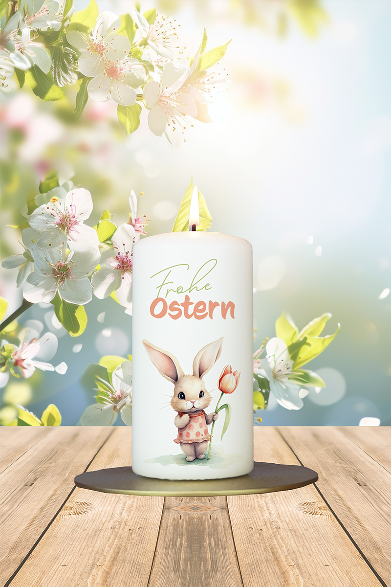 Dieses niedliche Osterhasenmädchen mit einer Tulpe bringt den Frühling direkt ins Herz. Die liebevolle Illustration und der klassische Gruß „Frohe Ostern“ machen diese Kerze zu einem bezaubernden Lichtgruß für Groß und Klein.