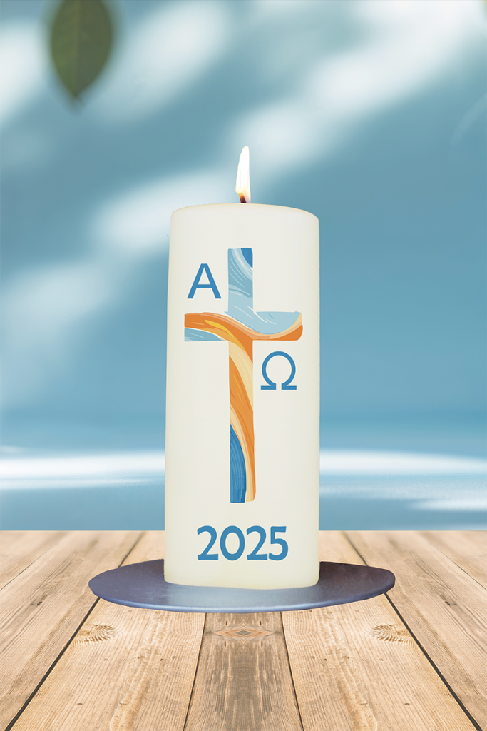 Modern und farbstark: Diese Osterkerze besticht durch ihr kräftiges Kreuz in Blau und Orange – kombiniert mit den Zeichen Alpha & Omega. Ein kraftvolles Glaubenslicht für das aktuelle Osterjahr, das moderne Akzente setzt.