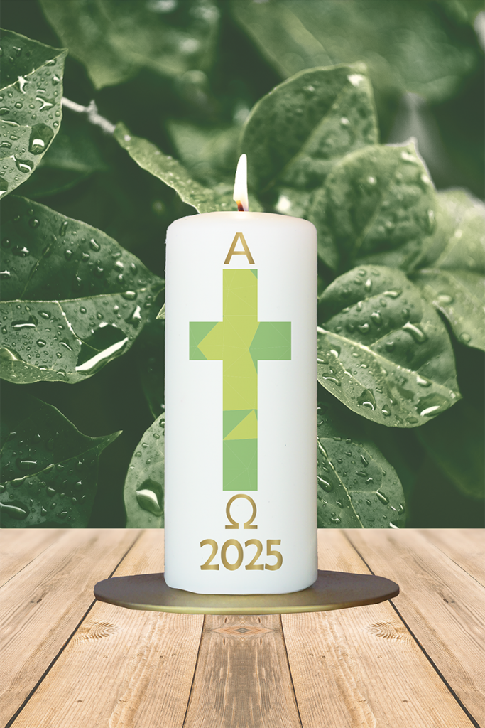Klare Formen, ruhige Grüntöne und goldene Glaubenszeichen: Diese stilvolle Kerze verbindet Struktur und Sinn. Ein elegantes Osterlicht für das aktuelle Jahr – passend für alle, die modernes Design und spirituelle Tiefe schätzen.