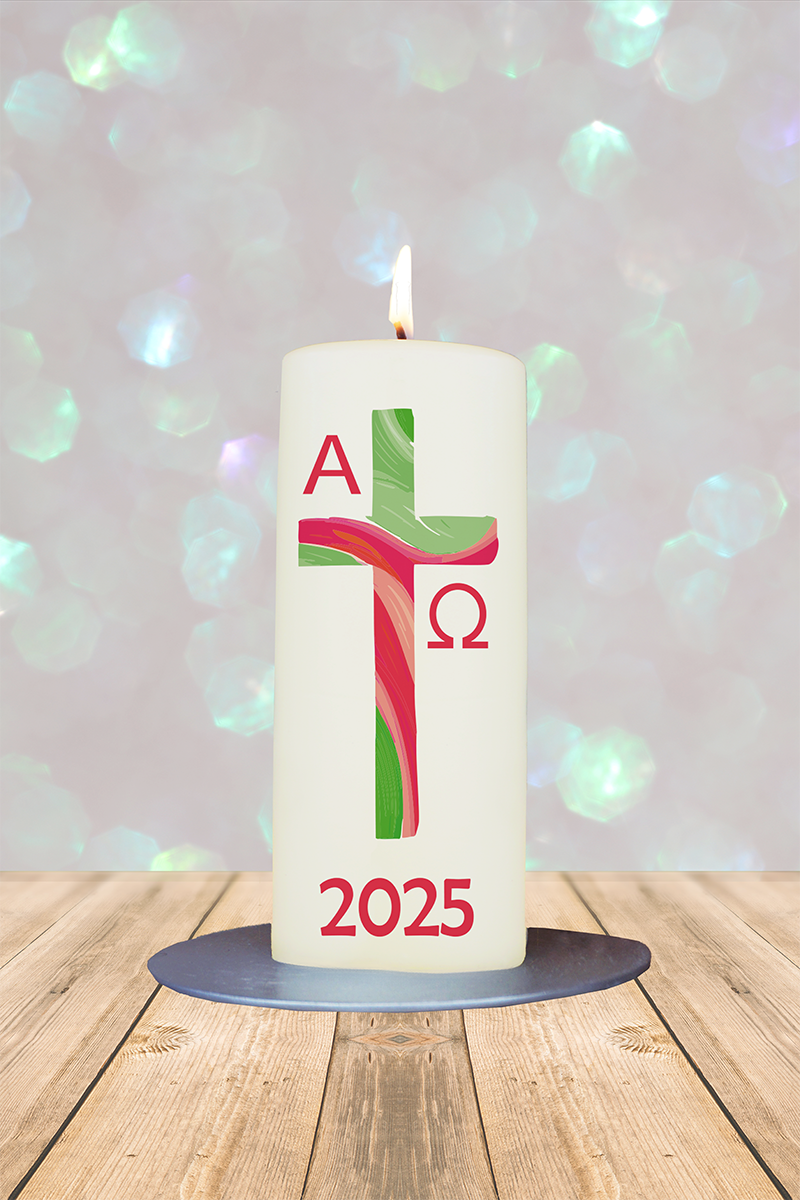 Diese Osterkerze strahlt in kräftigen Rot- und Grüntönen – lebendig und kraftvoll zugleich. Die roten Alpha- & Omega-Symbole setzen ein leuchtendes Glaubenszeichen für das aktuelle Jahr.