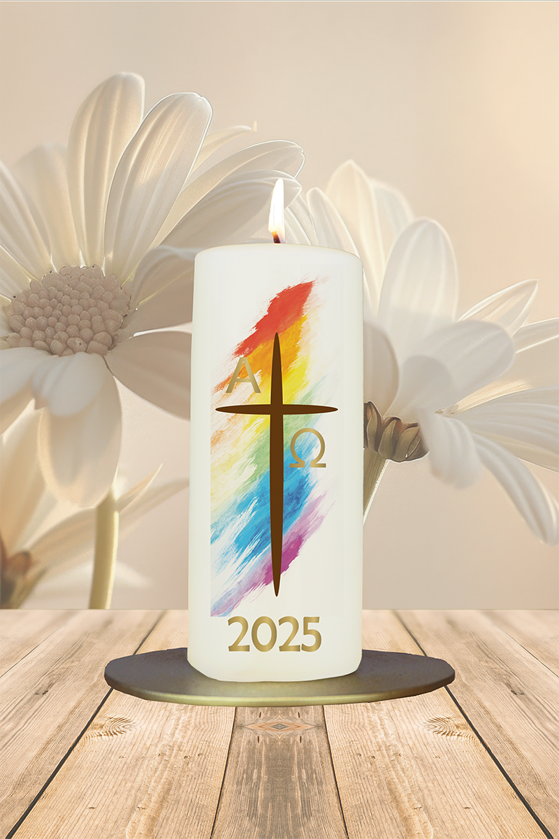 Ein Kreuz, das sich über ein Regenbogenband spannt – ein starkes Zeichen für Hoffnung, Vielfalt und Versöhnung. Mit den roten Alpha & Omega-Symbolen ist diese Kerze ein leuchtender Ausdruck gelebten Glaubens im aktuellen Jahr.