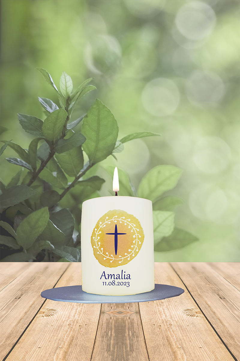 Patenkerze Taufe/Kommunion 8x6cm Amalia Glaube Liebe Hoffnung gelb