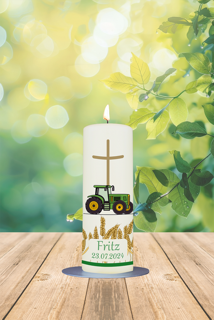Manchmal darf Dein Licht genau so bodenständig und herzlich sein: Der grüne Trecker mit seinen gelben Reifen steht im Kornfeld vor einem schlichten Kreuz und zeigt, wie sehr Du verwurzelt bist. Dein Name und Datum machen diese Kerze zu einem besonderen Symbol für Heimat, Zusammenhalt und Gottes Segen auf allen Wegen.