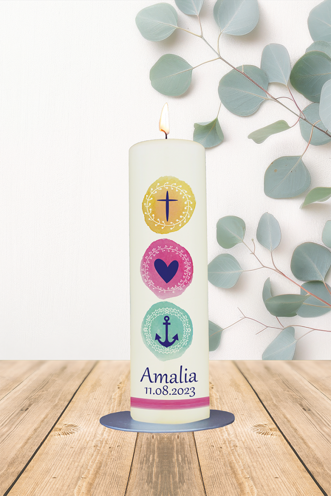 Glaube, Liebe, Hoffnung – drei Symbole, die jedem Lebensweg Halt geben. Diese Kerze verbindet Kreuz, Herz und Anker in runden, farbenfrohen Plaketten zu einem klaren Zeichen für alles, was Dich stärkt. Dein Name und Datum machen daraus ein persönliches Licht, das Dich daran erinnert, dass Du nie alleine bist.