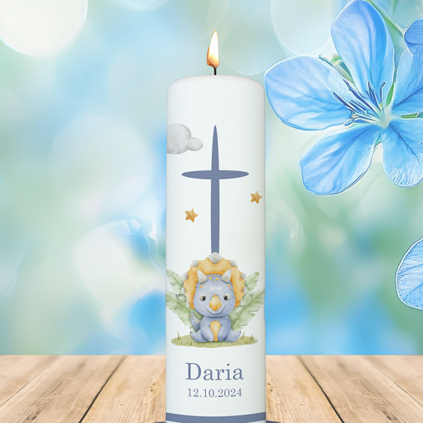 Fröhlich, kindlich und mit einer symbolischen Tiefe: Der gefiederte Dino vor dem blauen Kreuz bringt verspielte Leichtigkeit und spirituelle Bedeutung zusammen. Der Name „Daria“ in Blau kann selbstverständlich personalisiert werden – ebenso wie das Datum.