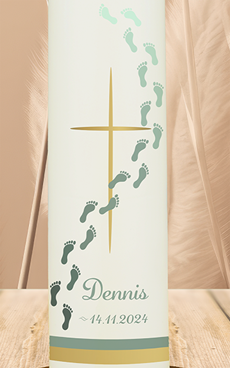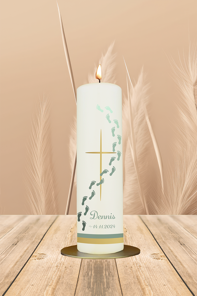 Mit einem goldenen Kreuz vor einem Fußspuren-Weg erzählt diese Kerze von göttlicher Führung, vom Licht auf dunklen Wegen und vom Vertrauen in jeden Neubeginn. Die Farbe Gold steht für Wert, Wärme und das Besondere – passend zur Taufe, wo der Grundstein für ein Leben im Glauben gelegt wird. Ein bedeutungsvolles Licht für „Dennis“ – oder einen anderen kleinen Lieblingsmenschen.