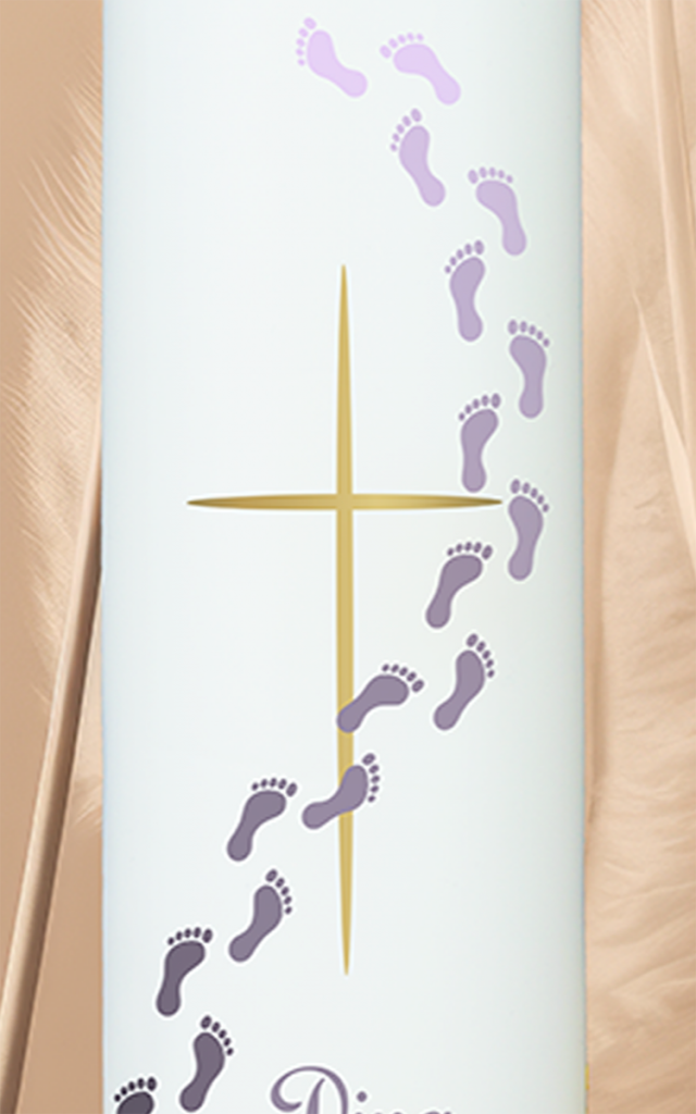 Hier trifft die spirituelle Kraft der violetten Fußspuren auf das strahlende Symbol der göttlichen Gegenwart: ein goldenes Kreuz. Diese Kerze verbindet Lebensweg und Glaubensstärke, Tradition und Gefühl – ein besonders symbolreiches Licht für die Taufe. Individuell personalisierbar mit Name und Datum.